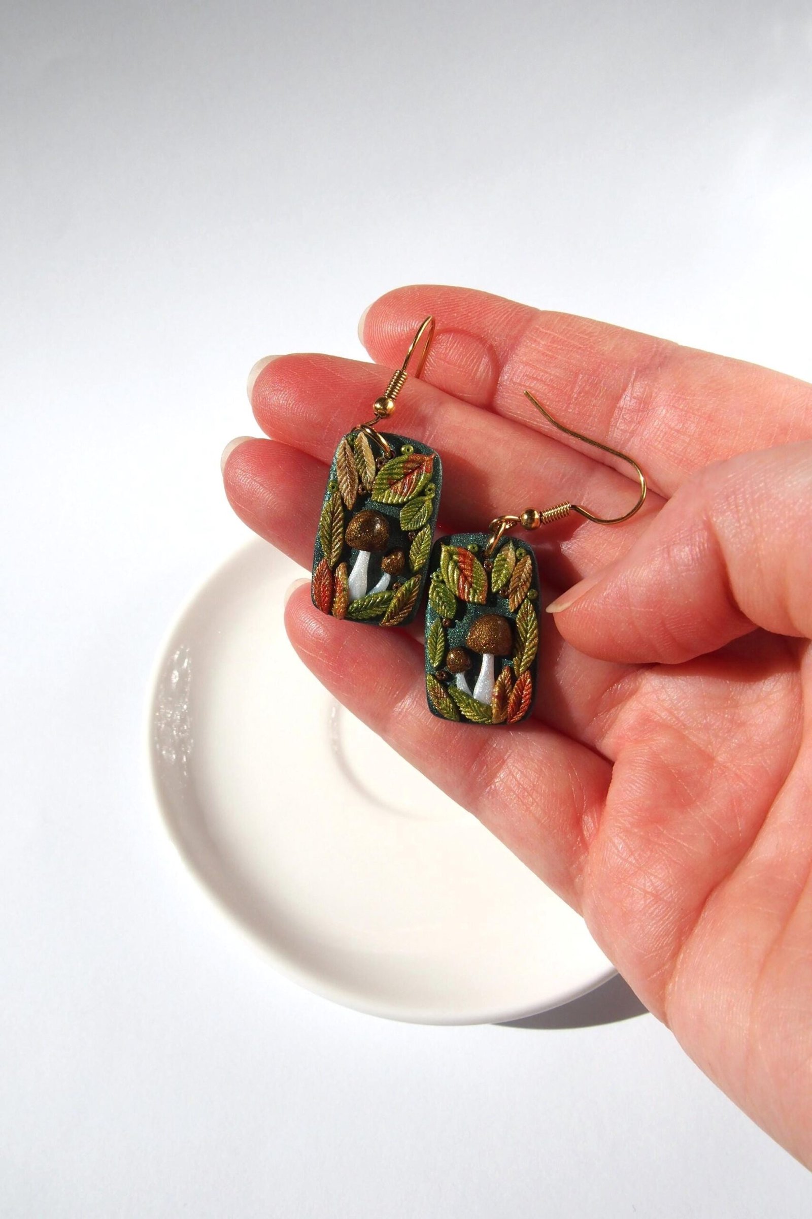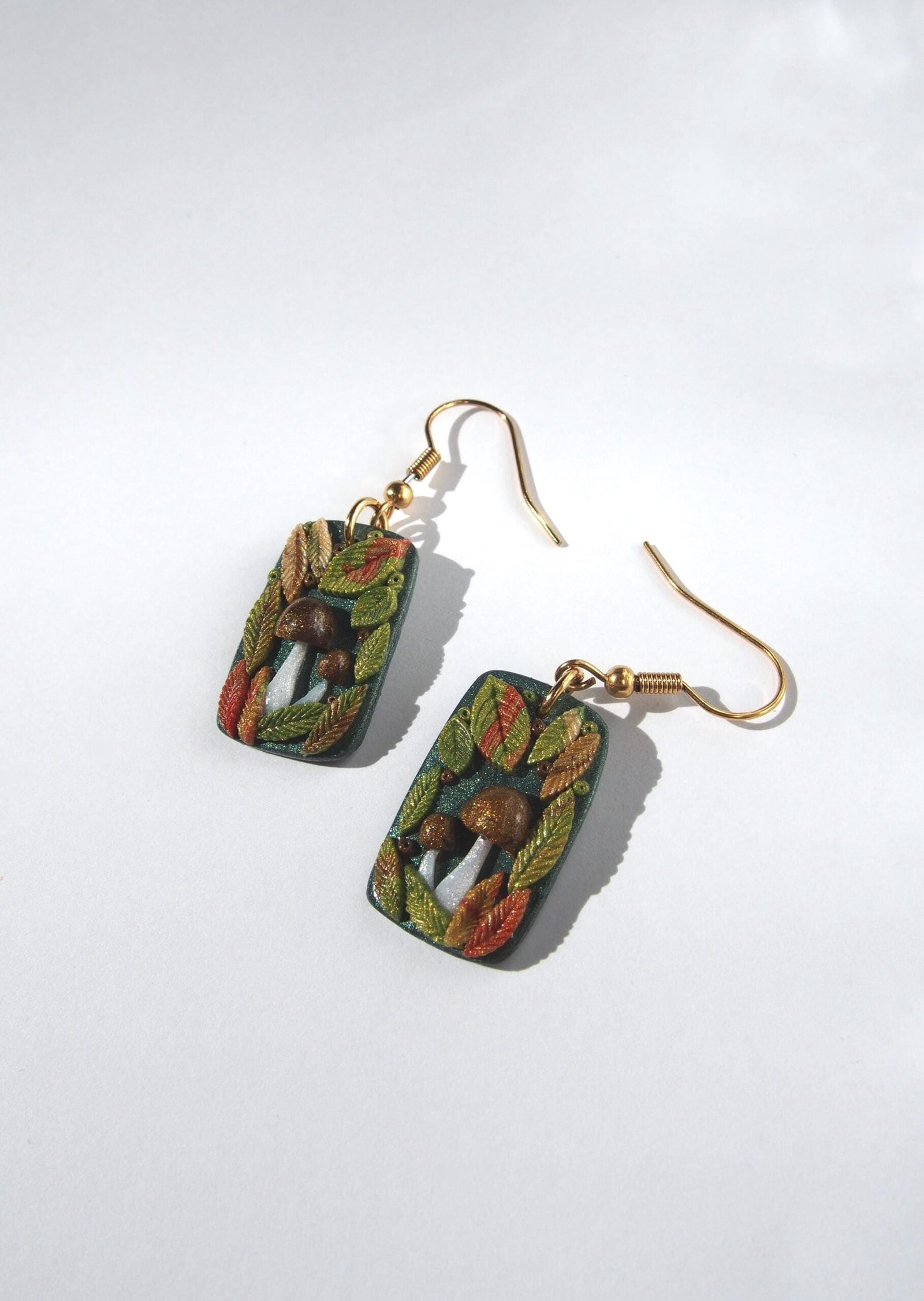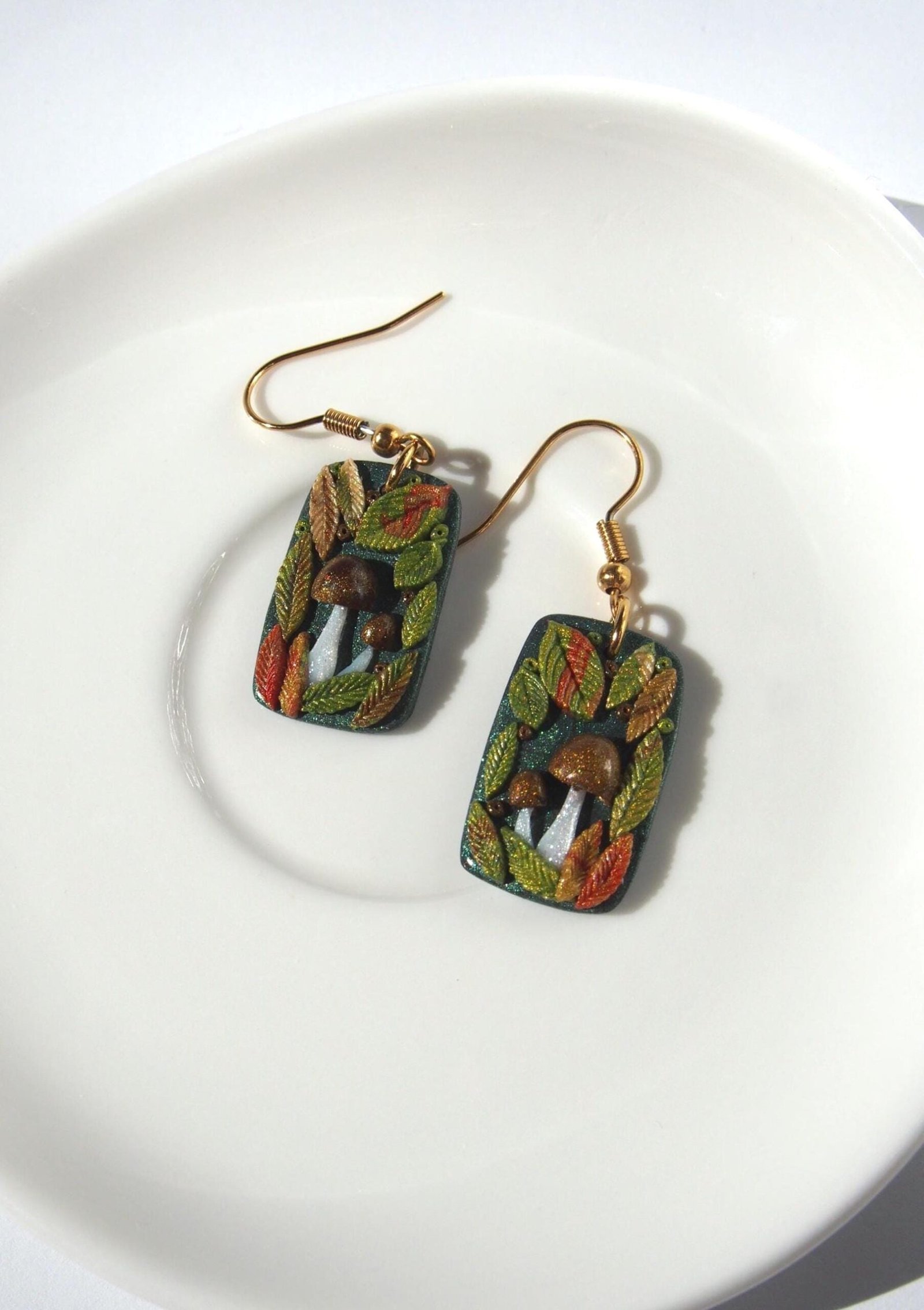 Like all my creations, these mushroom earrings are handmade and one of a kind, celebrating the unique character that comes from a handmade process. Each earring features a charming scene with brown mushrooms nestled among a wreath of colorful autumn leaves created by hand. This detailed process ensures the pair you see pictured is the exact one you will receive.