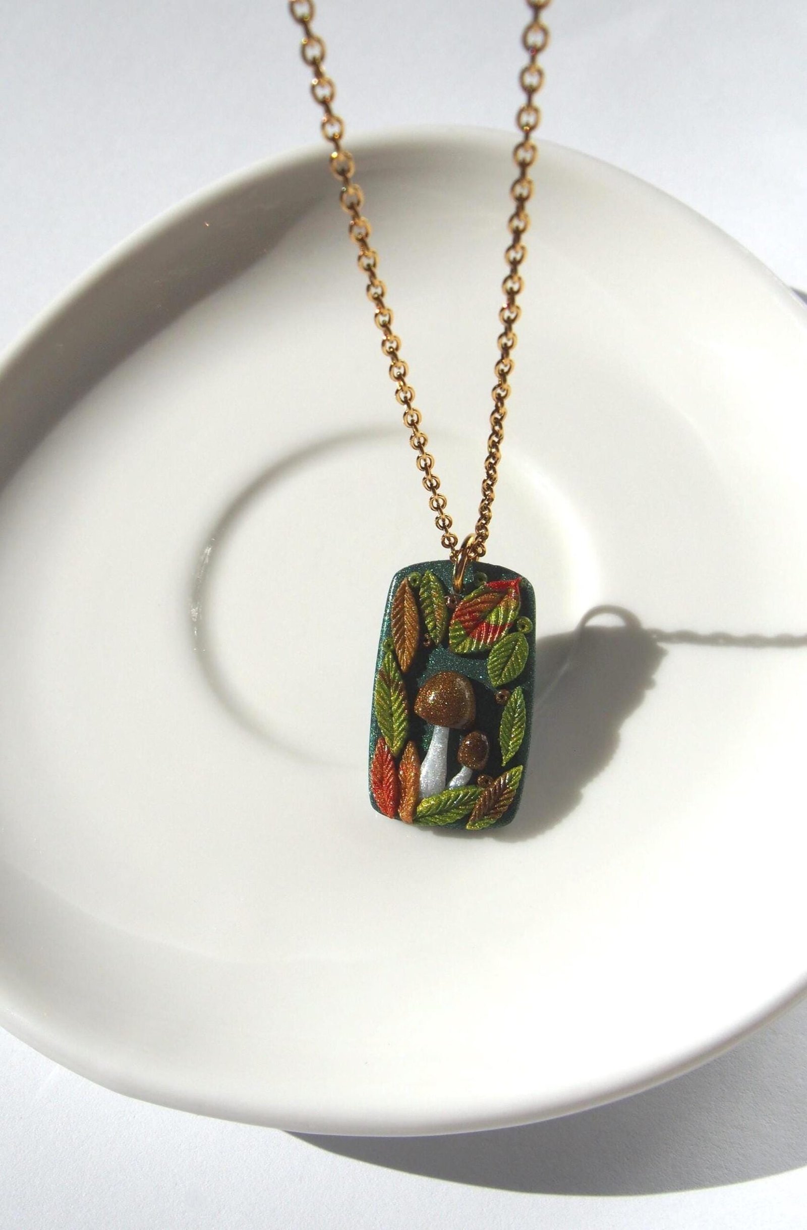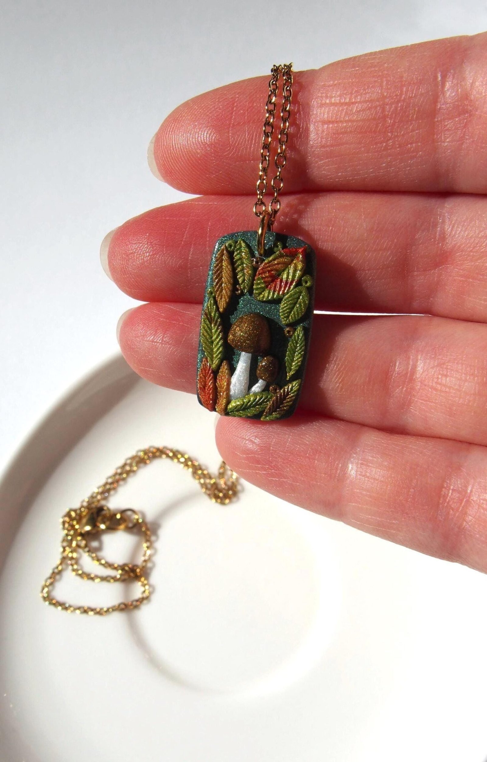 Like all my creations, this mushroom necklace is handmade and one of a kind, celebrating the unique character that comes from a handmade process. The pendant features a charming scene with brown mushrooms nestled among a wreath of colorful autumn leaves, carefully composed by hand. This detailed process ensures the piece you see pictured is the exact one you will receive.
