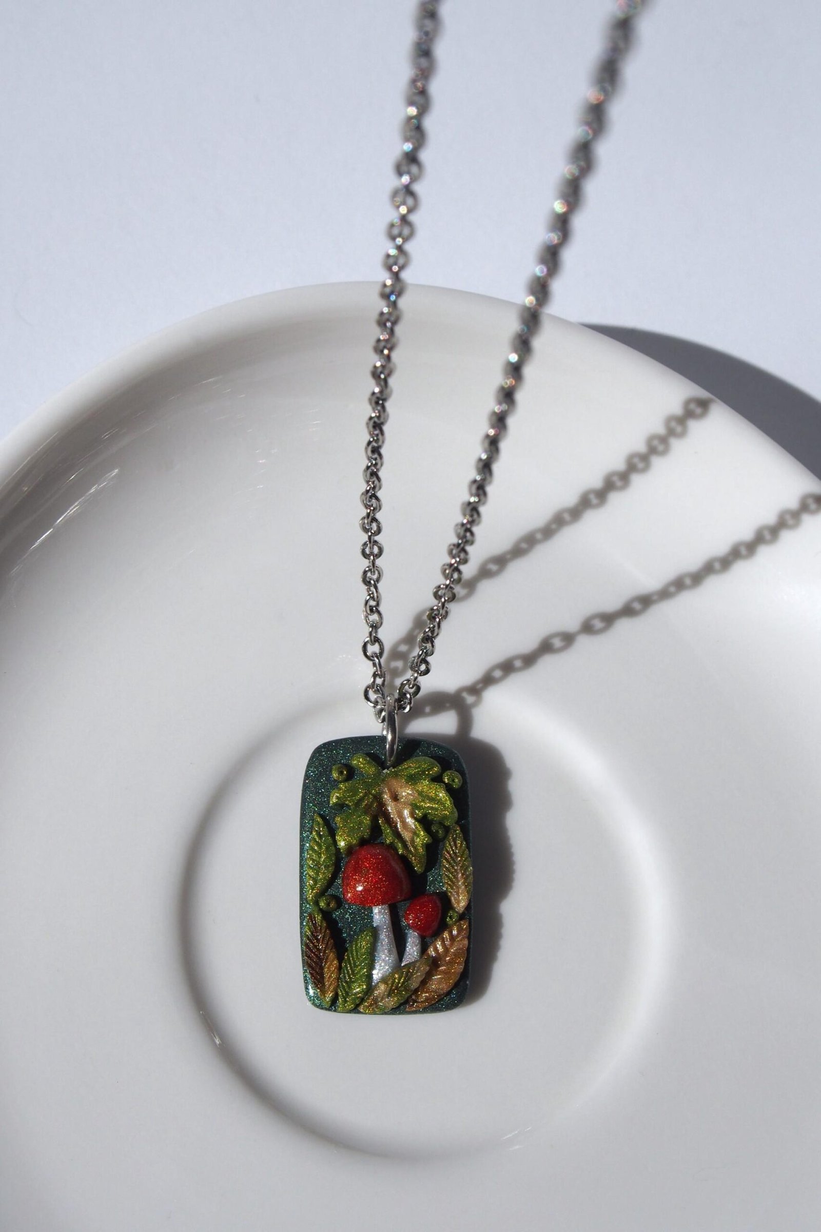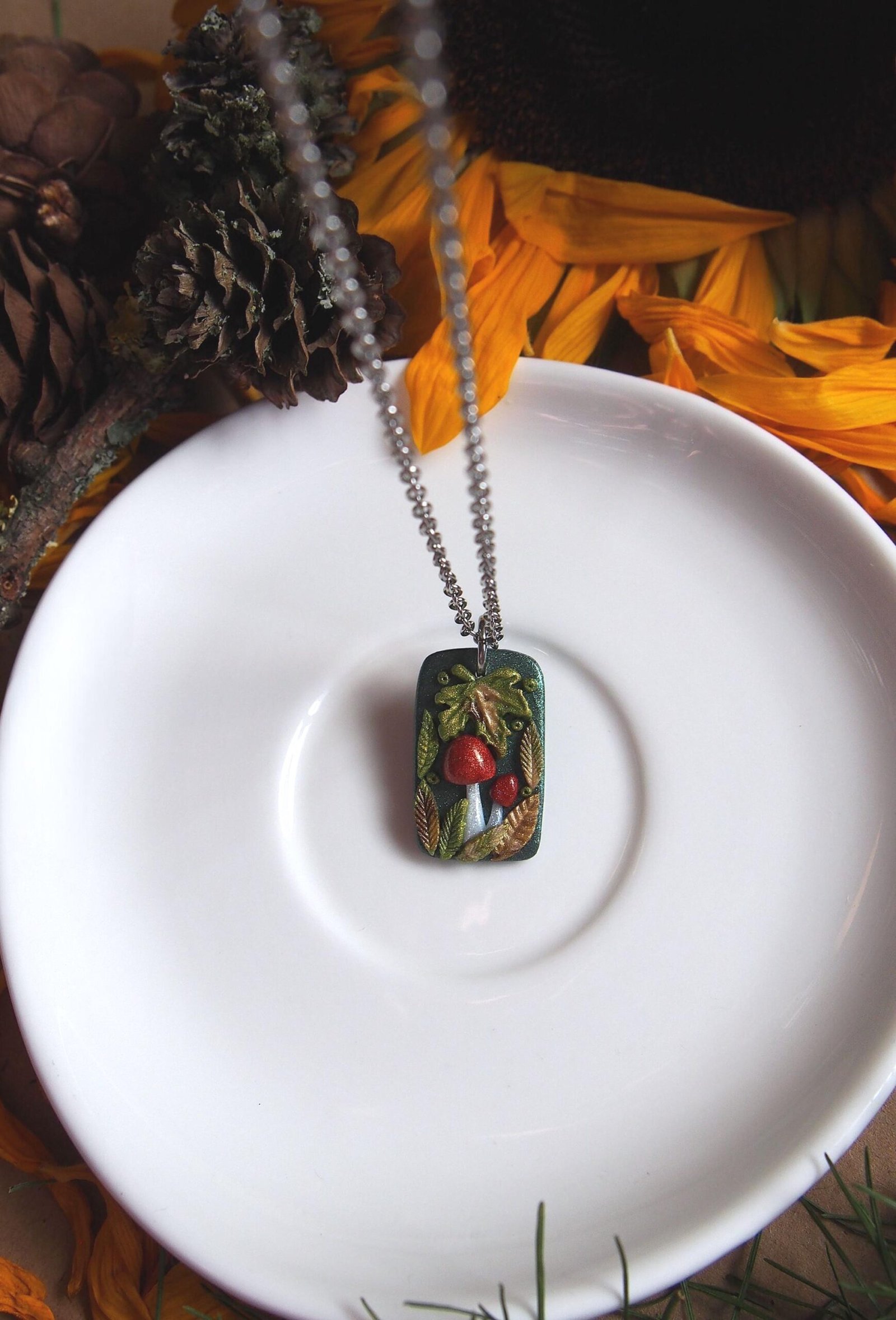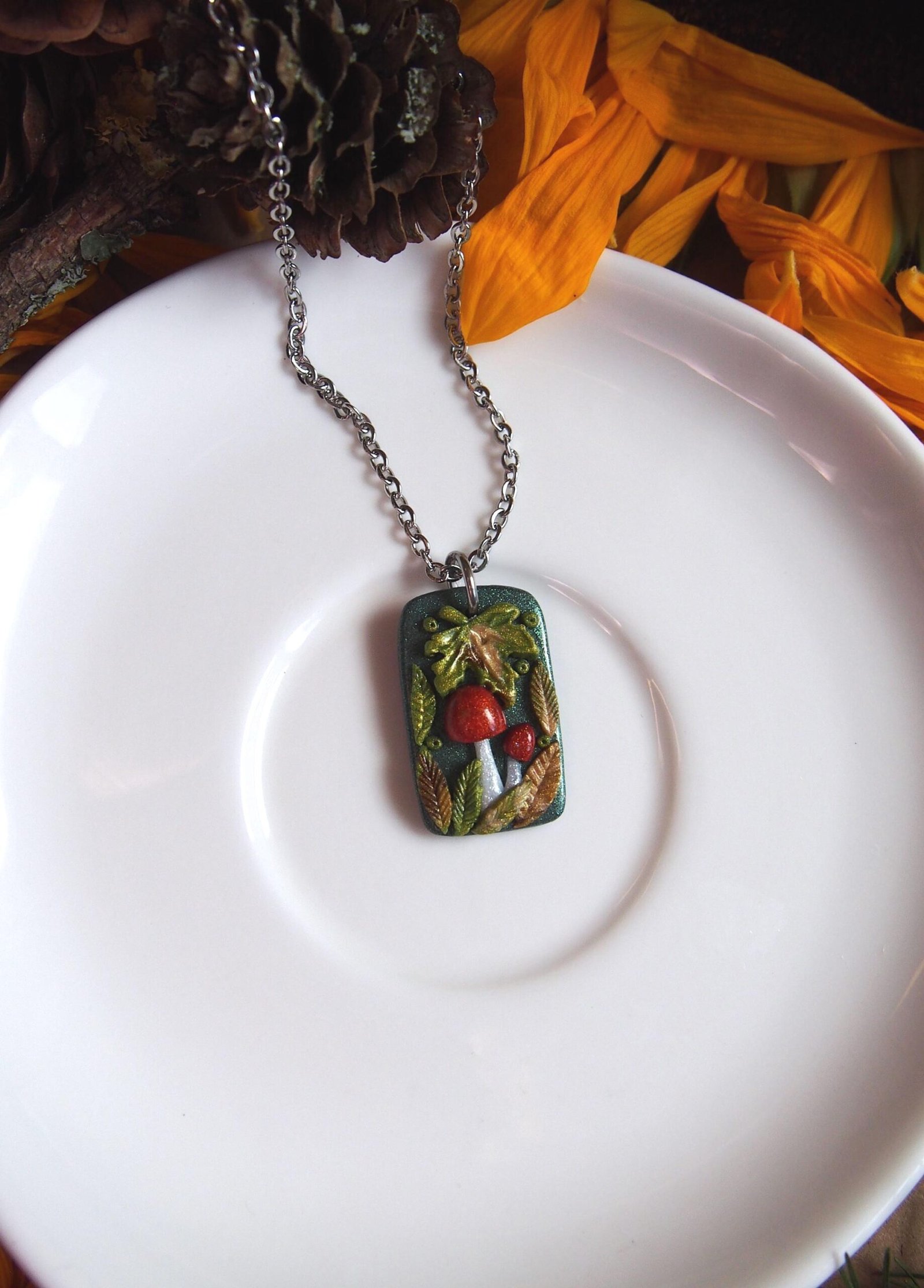 Like all my creations, this mushroom pendant is one of a kind, celebrating the unique character that comes from a handmade process. The autumn leaves are crafted from a blend of colored shiny clay for a rich, multi-tonal look. Each tiny element is then composed by hand, creating this magical miniature woodland scene. This detailed process ensures the piece you see pictured is the exact one you will receive.