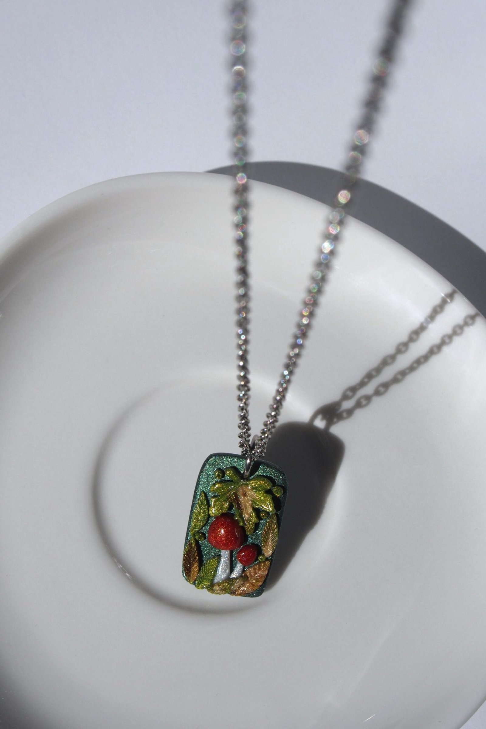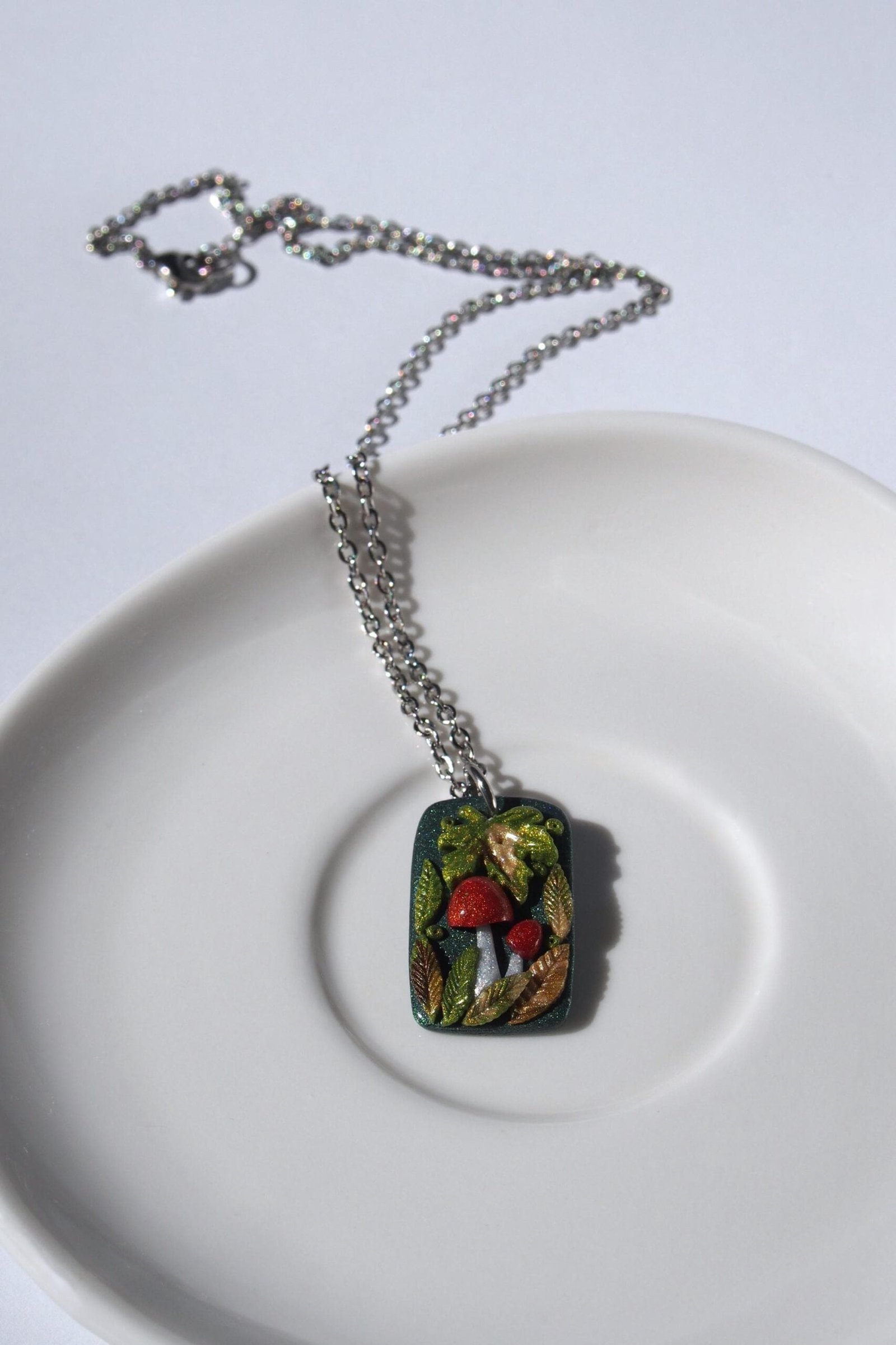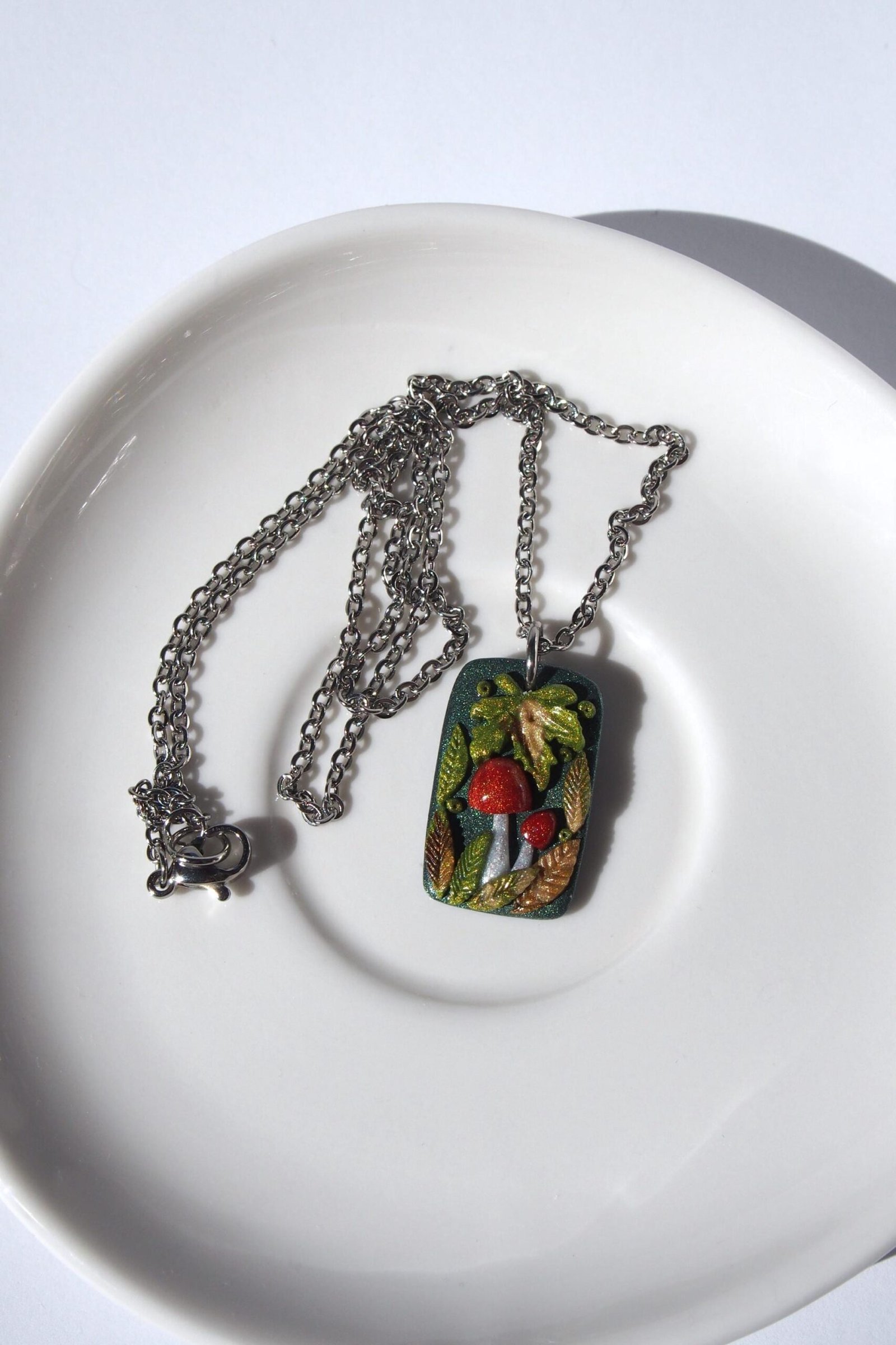 Like all my creations, this mushroom pendant is one of a kind, celebrating the unique character that comes from a handmade process. The autumn leaves are crafted from a blend of colored shiny clay for a rich, multi-tonal look. Each tiny element is then composed by hand, creating this magical miniature woodland scene. This detailed process ensures the piece you see pictured is the exact one you will receive.