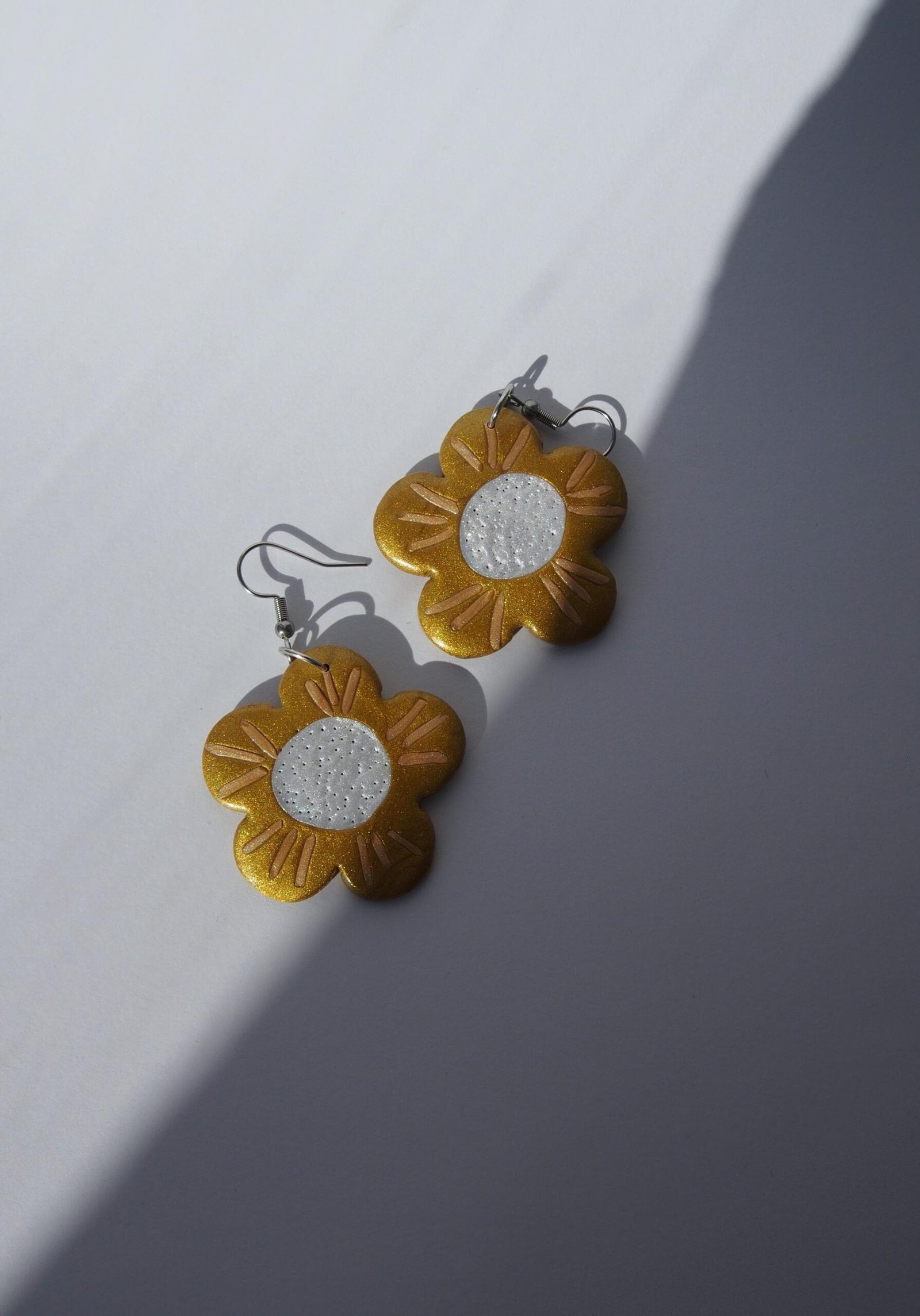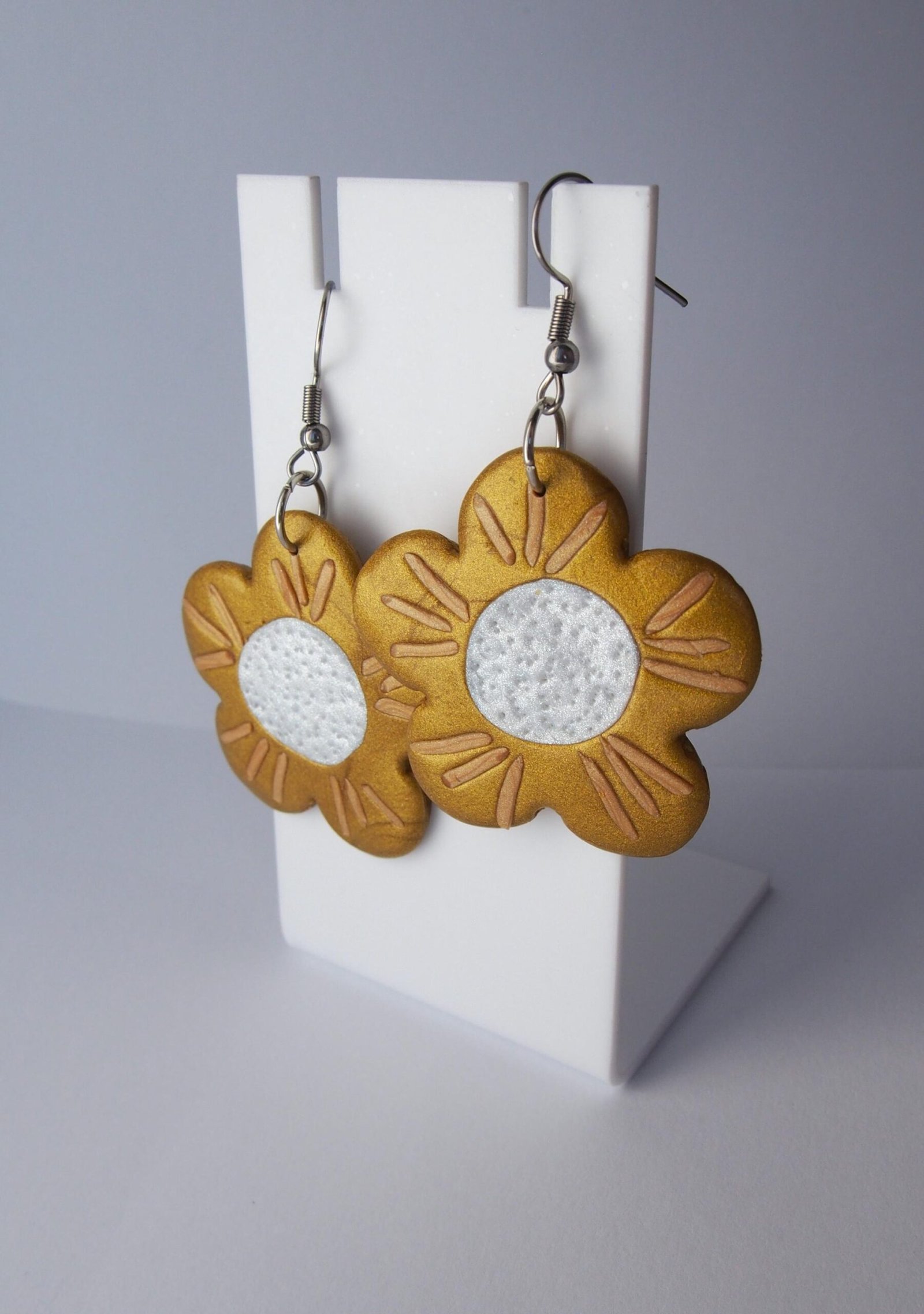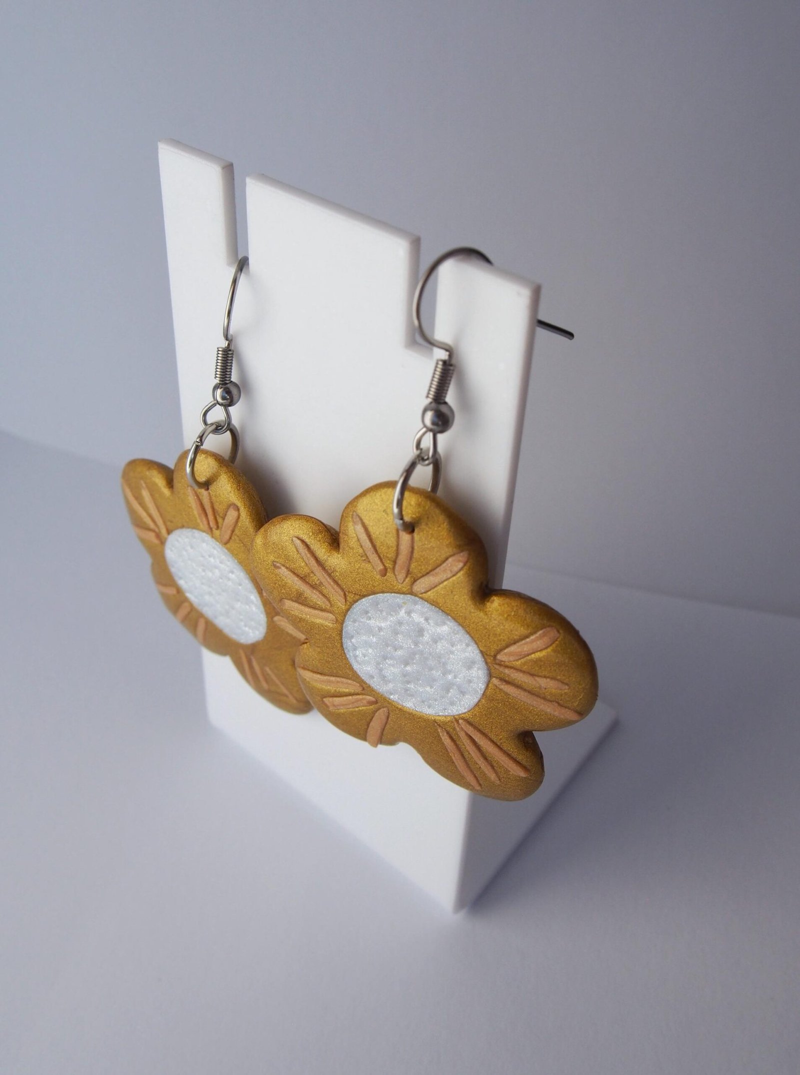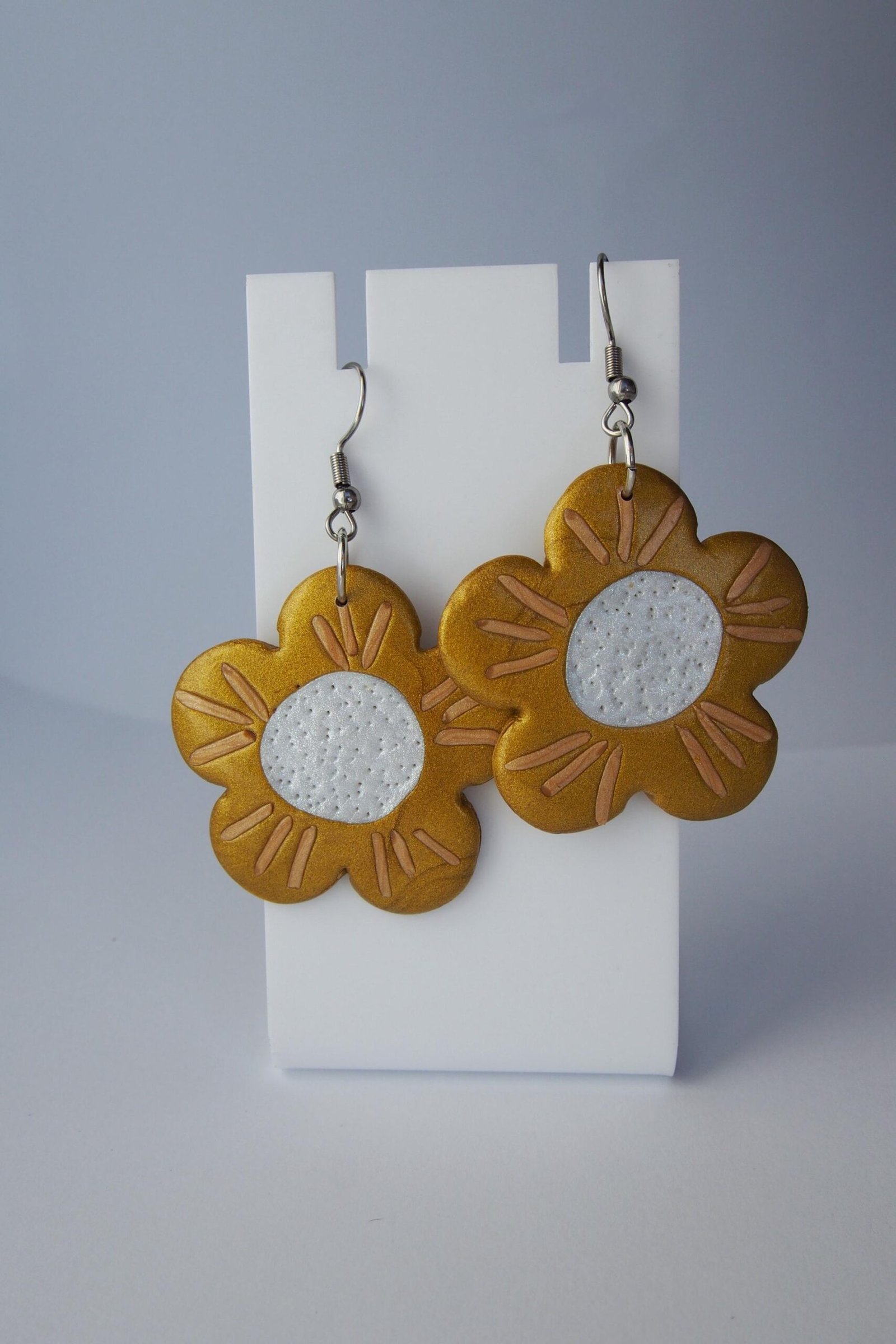 These flower earrings are perfect for those who love fun, whimsical jewelry and bold floral accessories. Handcrafted from polymer clay, this lightweight pair features charming flower shapes in shiny golden tones, engraved petal details, and a textured pearl-white center. Whether you adore botanical accessories, shiny floral jewelry, or simply love unique earrings, this pair will bring warmth to your collection and smiles to those around you.