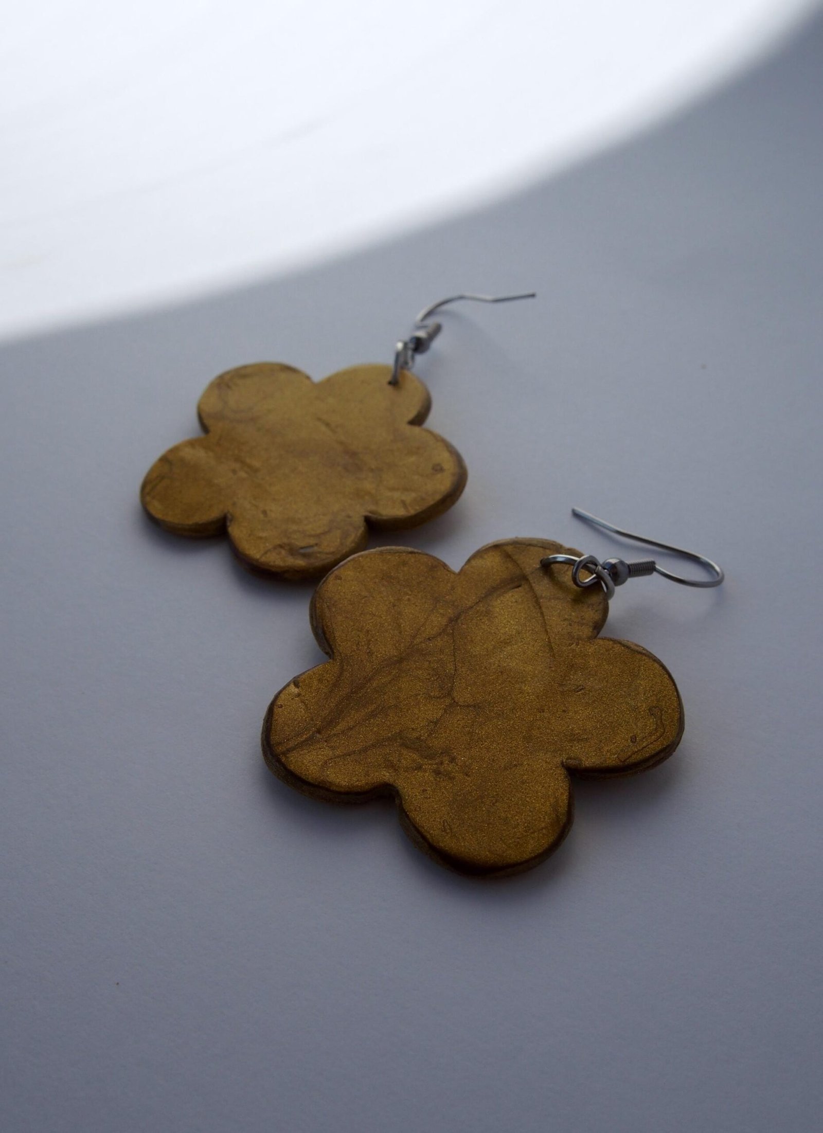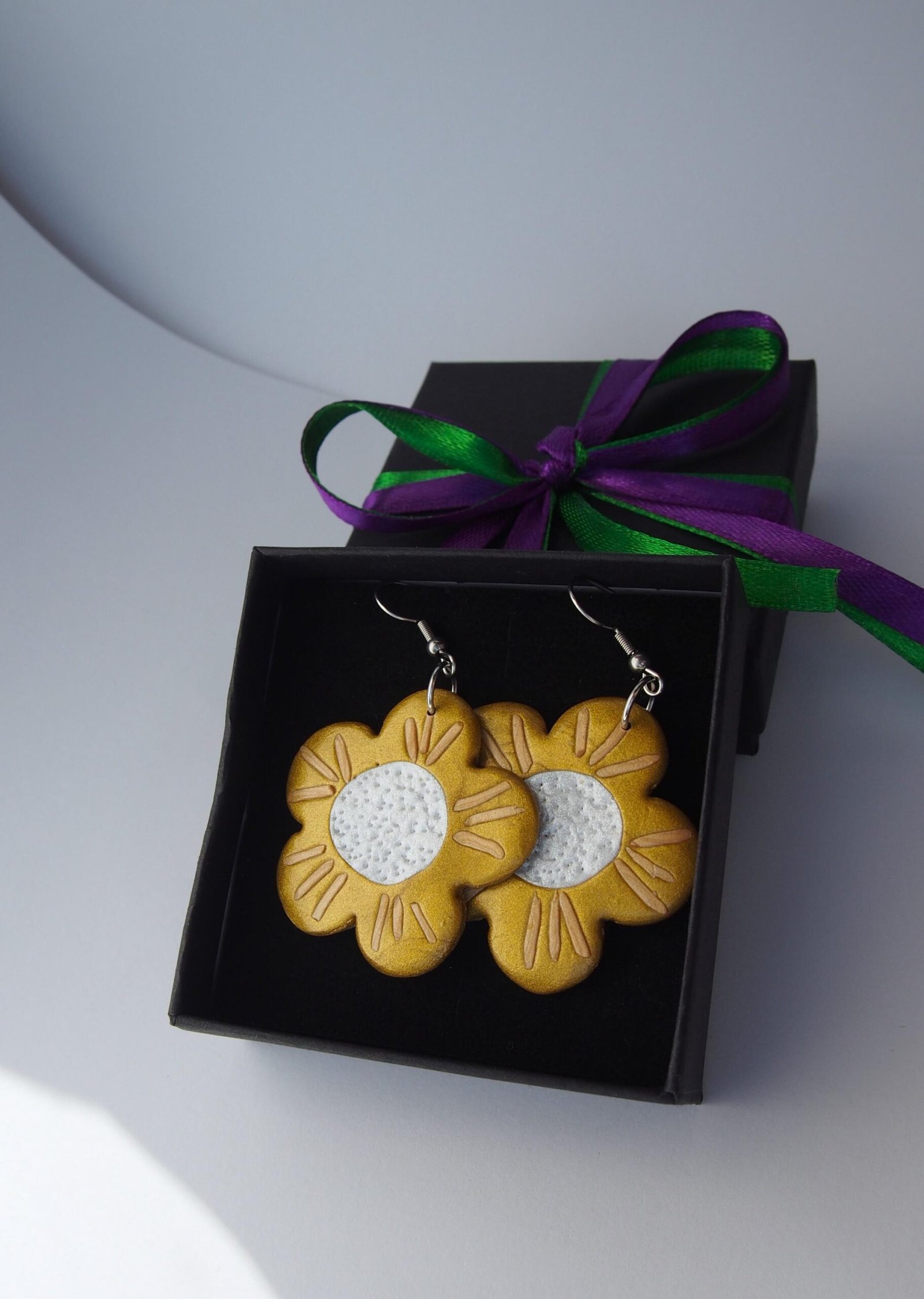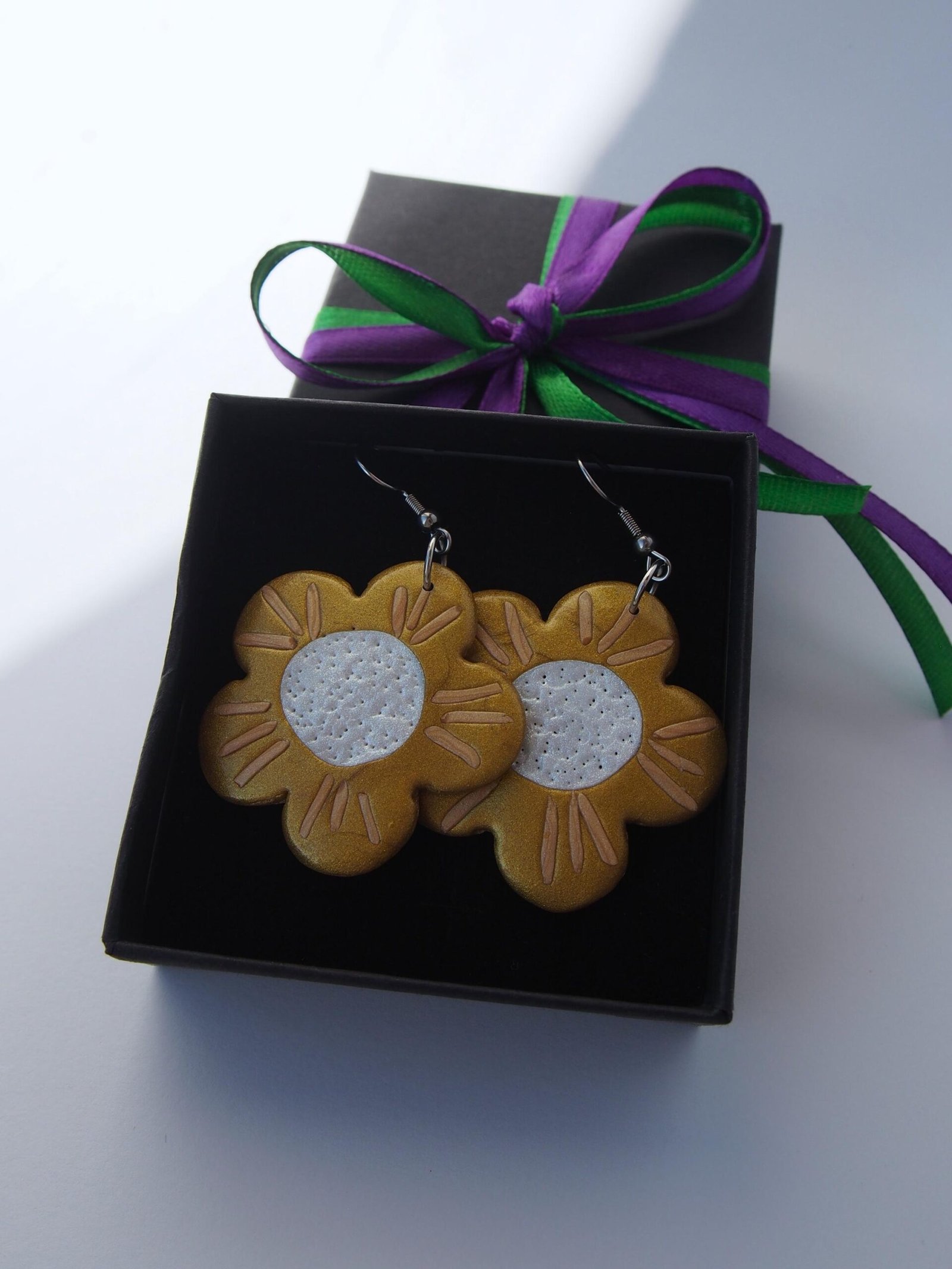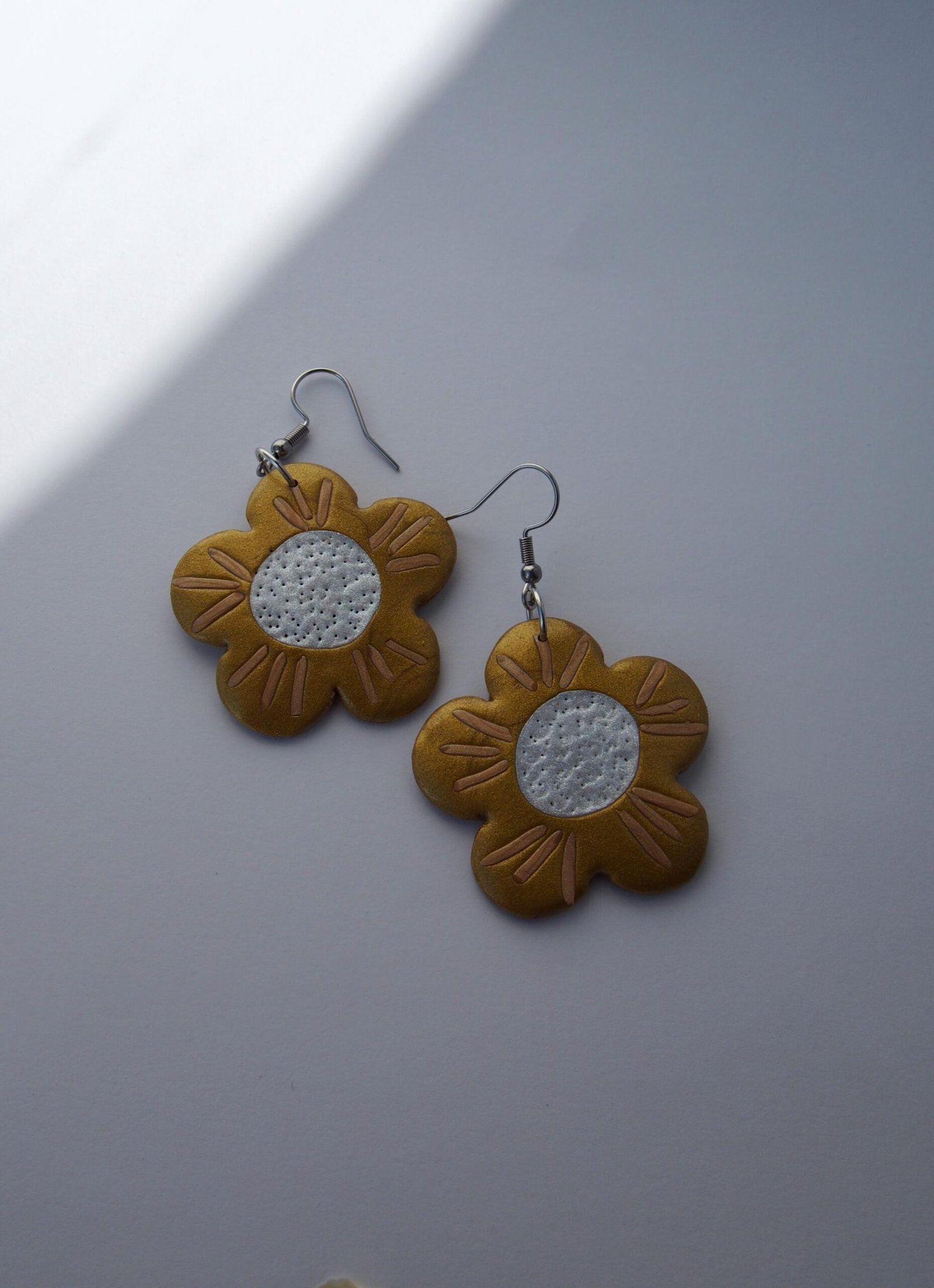 These flower earrings are perfect for those who love fun, whimsical jewelry and bold floral accessories. Handcrafted from polymer clay, this lightweight pair features charming flower shapes in shiny golden tones, engraved petal details, and a textured pearl-white center. Whether you adore botanical accessories, shiny floral jewelry, or simply love unique earrings, this pair will bring warmth to your collection and smiles to those around you.