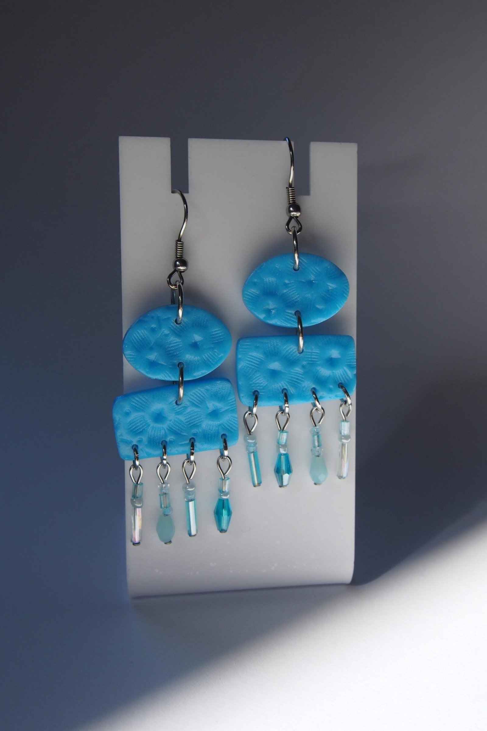 Like all my creations, this playful pair is one of a kind. Lightweight materials and a subtle texture, created using an old button that once belonged to my grandma, come together to create a whimsical, bohemian aesthetic full of movement and charm. Their soft blue tone and gently shimmering beads make them the perfect accent for bright days when the sky is clear and you’re feeling dreamy—or for cloudy days, when you need something positive and light to lift your mood.