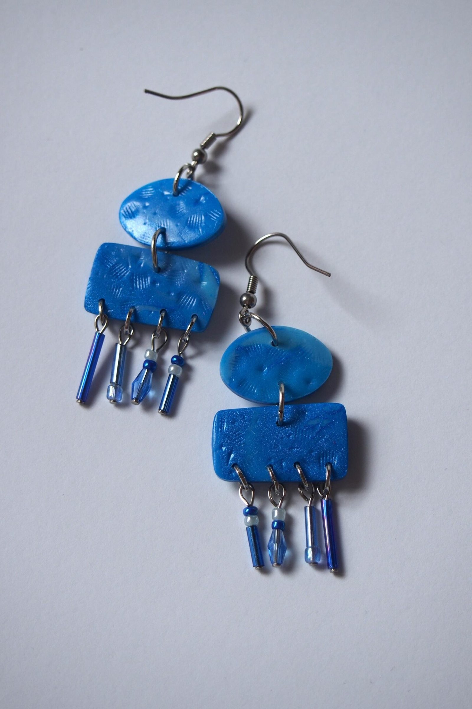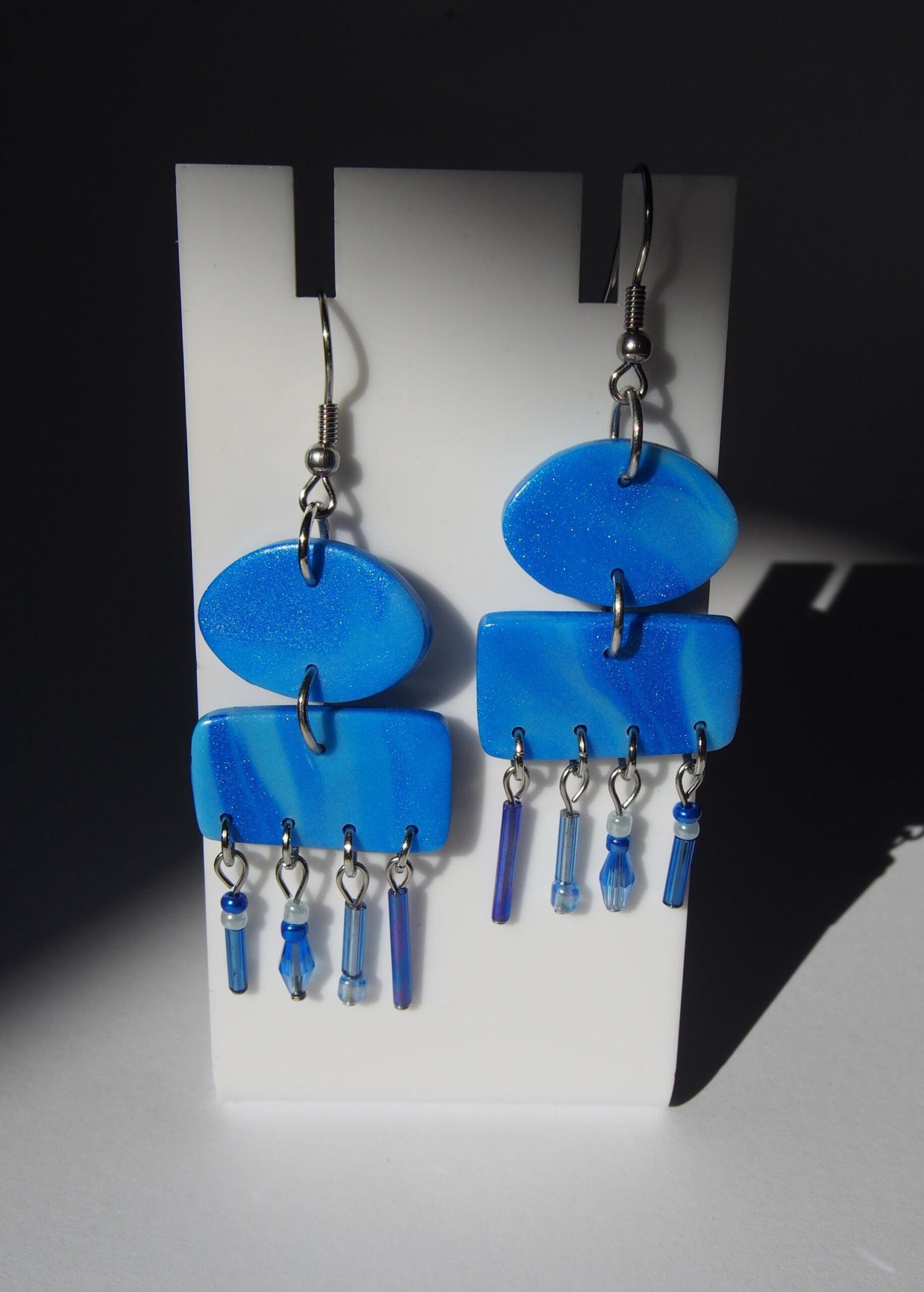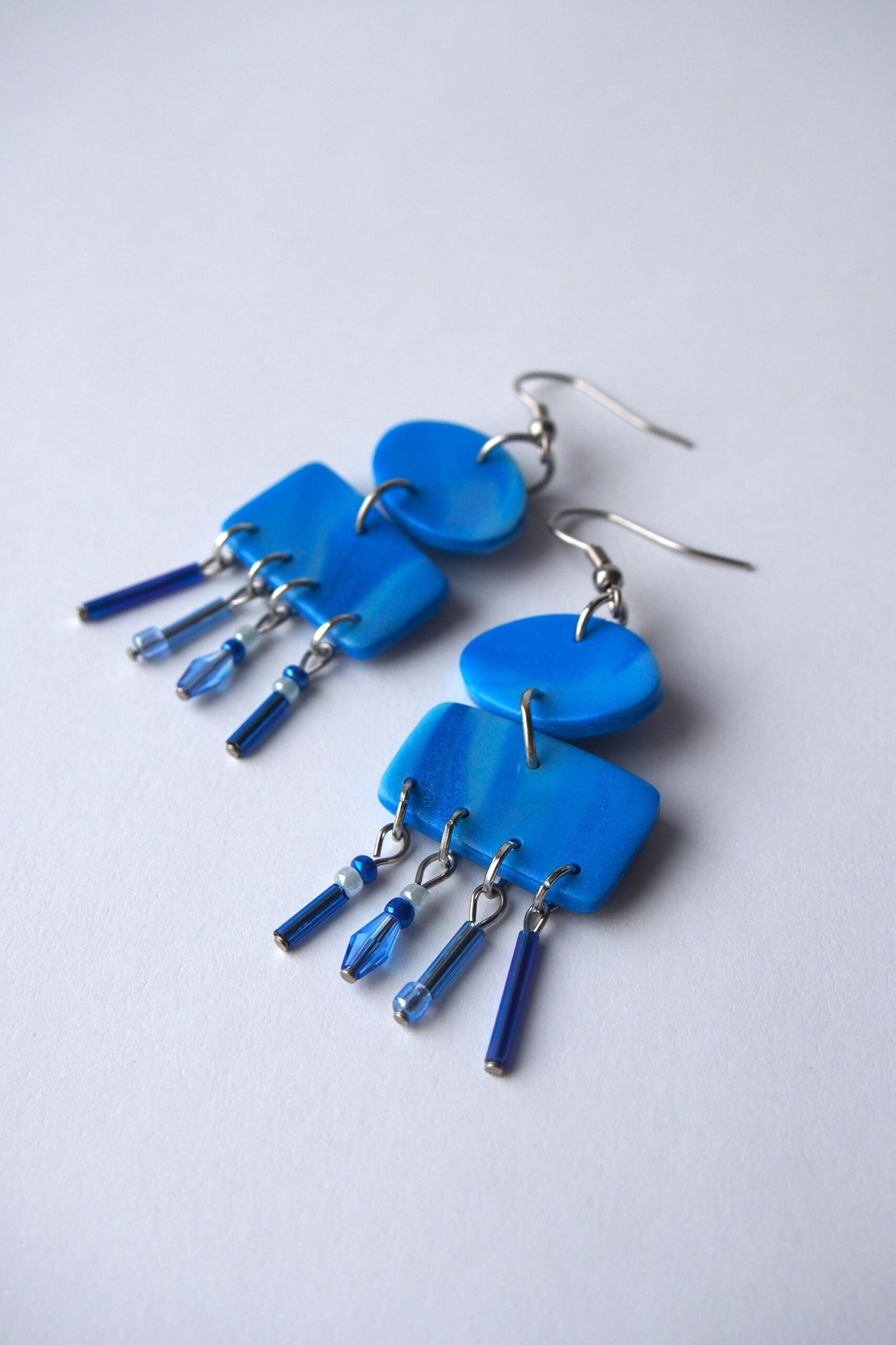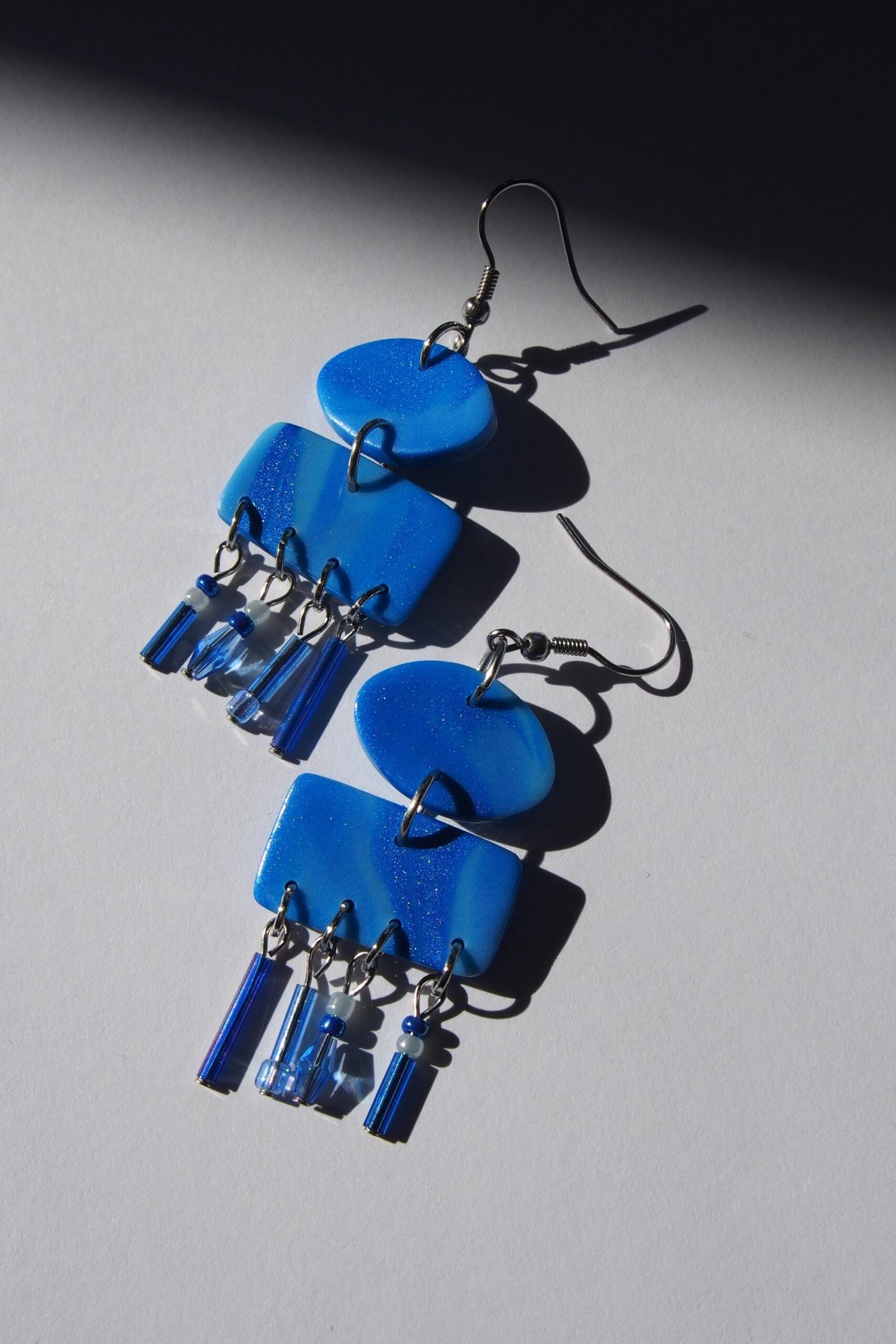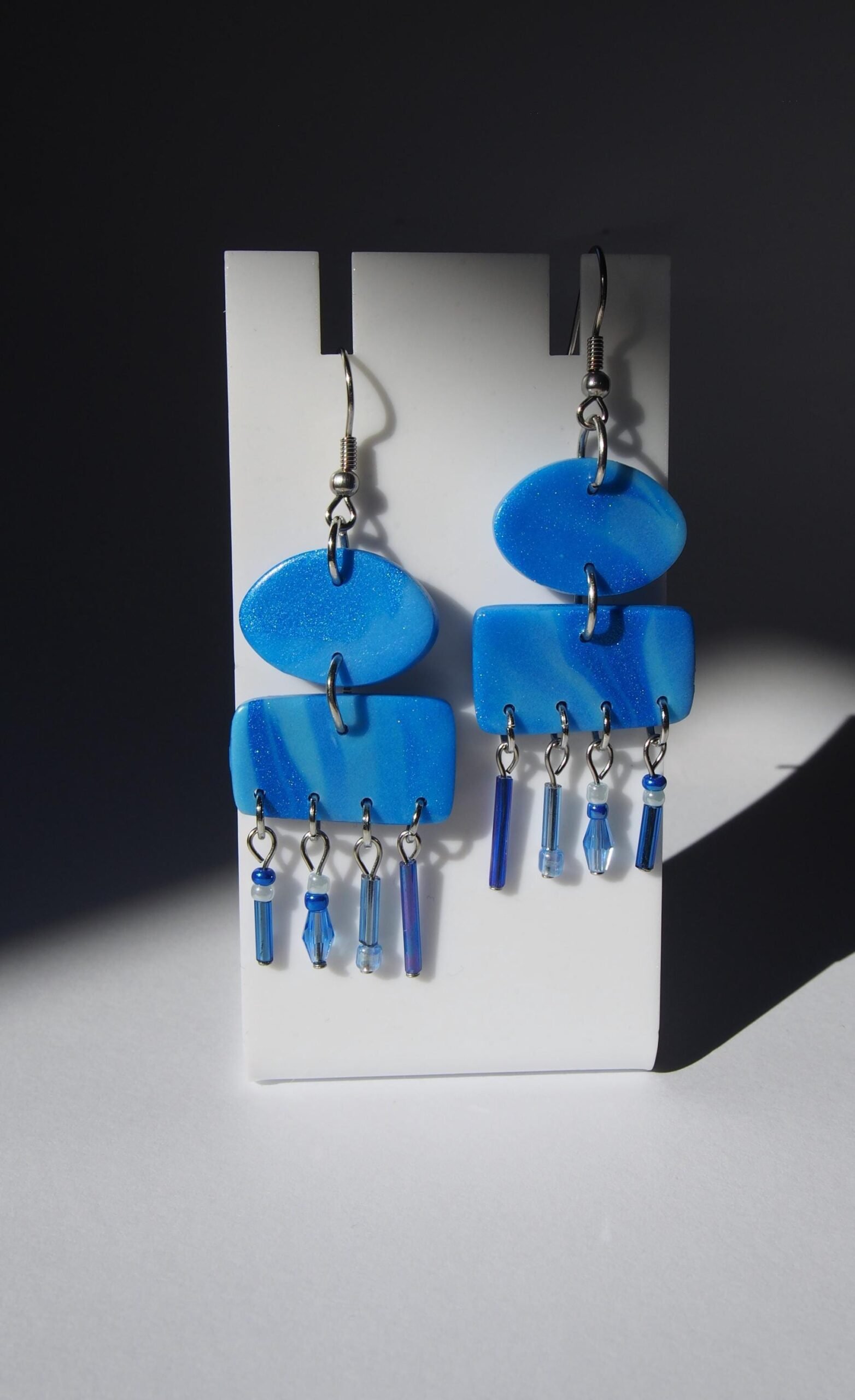 Like all my creations, this playful pair is one of a kind. Lightweight materials, minimalist abstract design, and dangling beads come together to create a modern bohemian aesthetic full of subtle movement and charm. Their soft blue color and dreamy design make them the perfect accent for breezy days and moments when you want something blue and special—a little piece of sky just for you.
