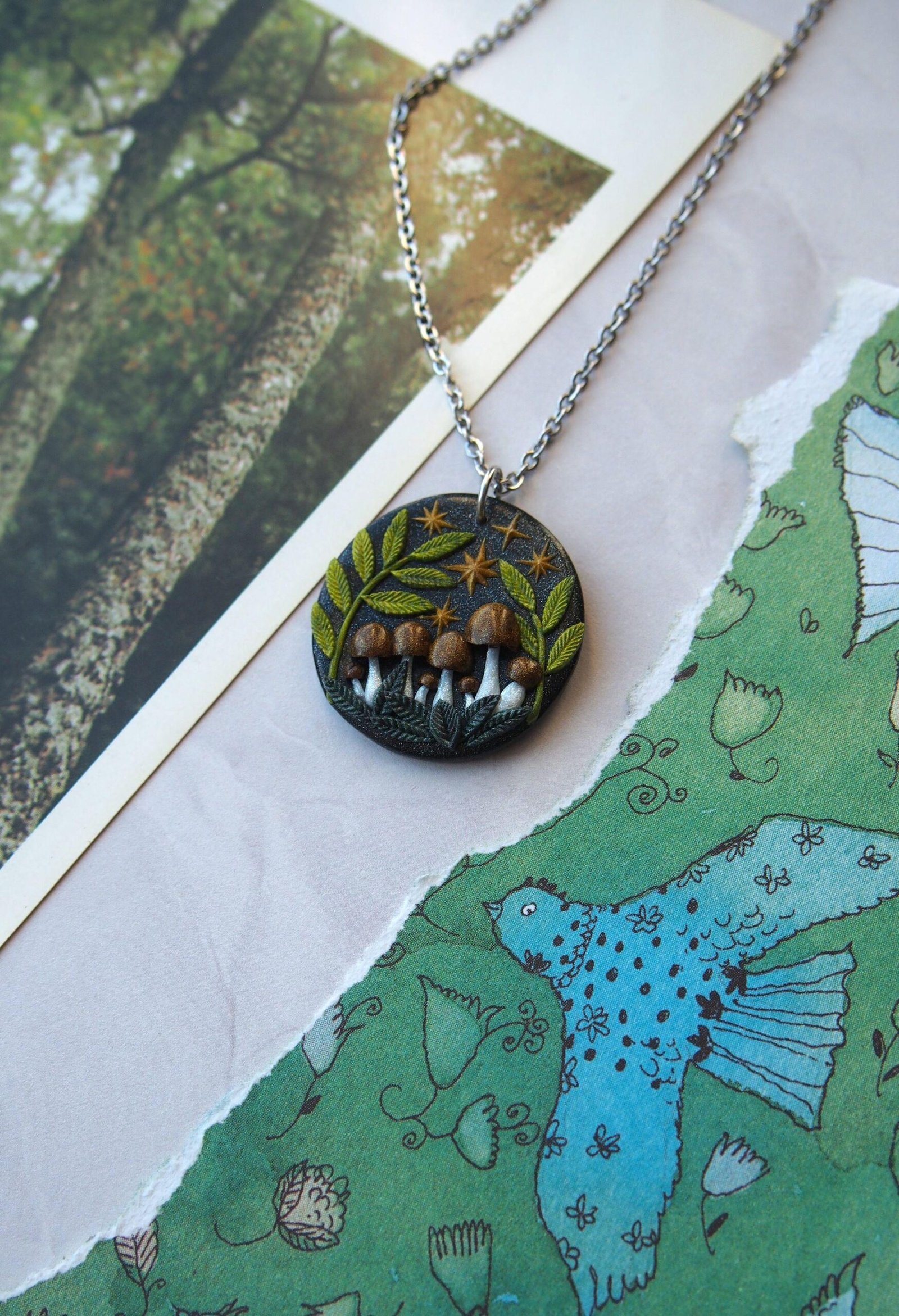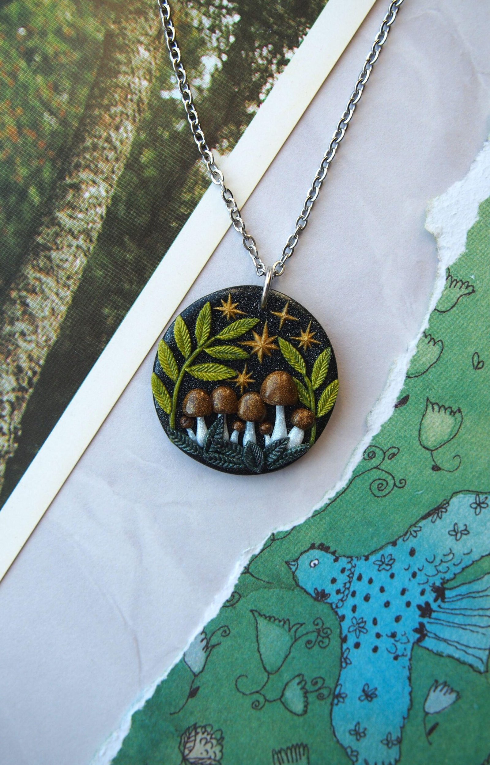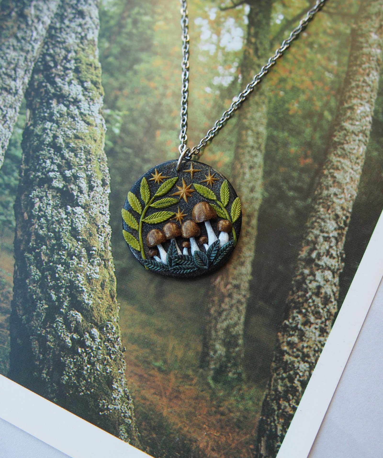 Larger Brown Mushroom Pendant – Celestial Fern Necklace – Polymer Clay & Stainless Steel