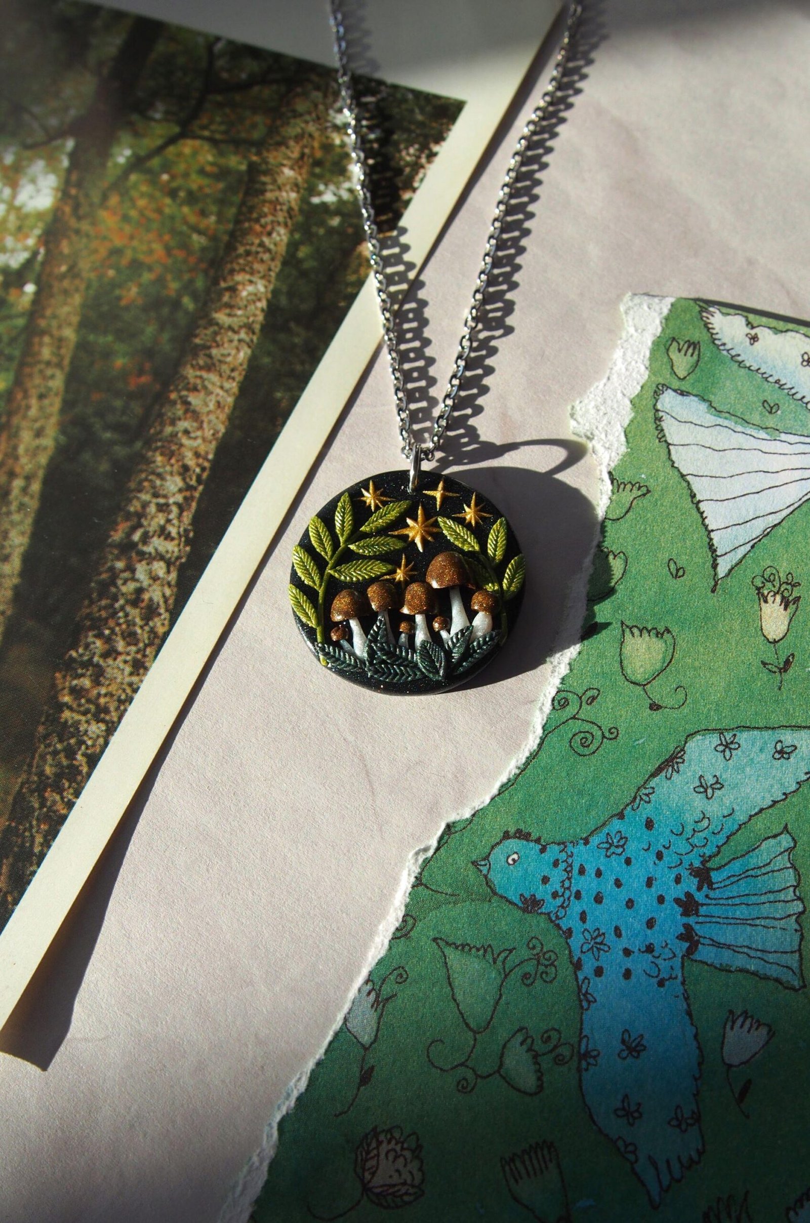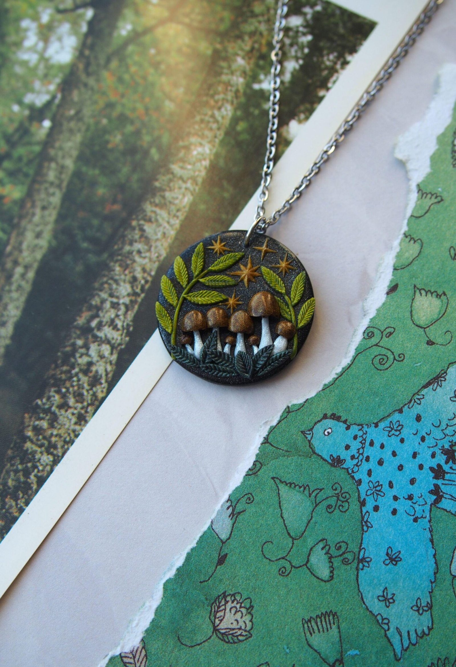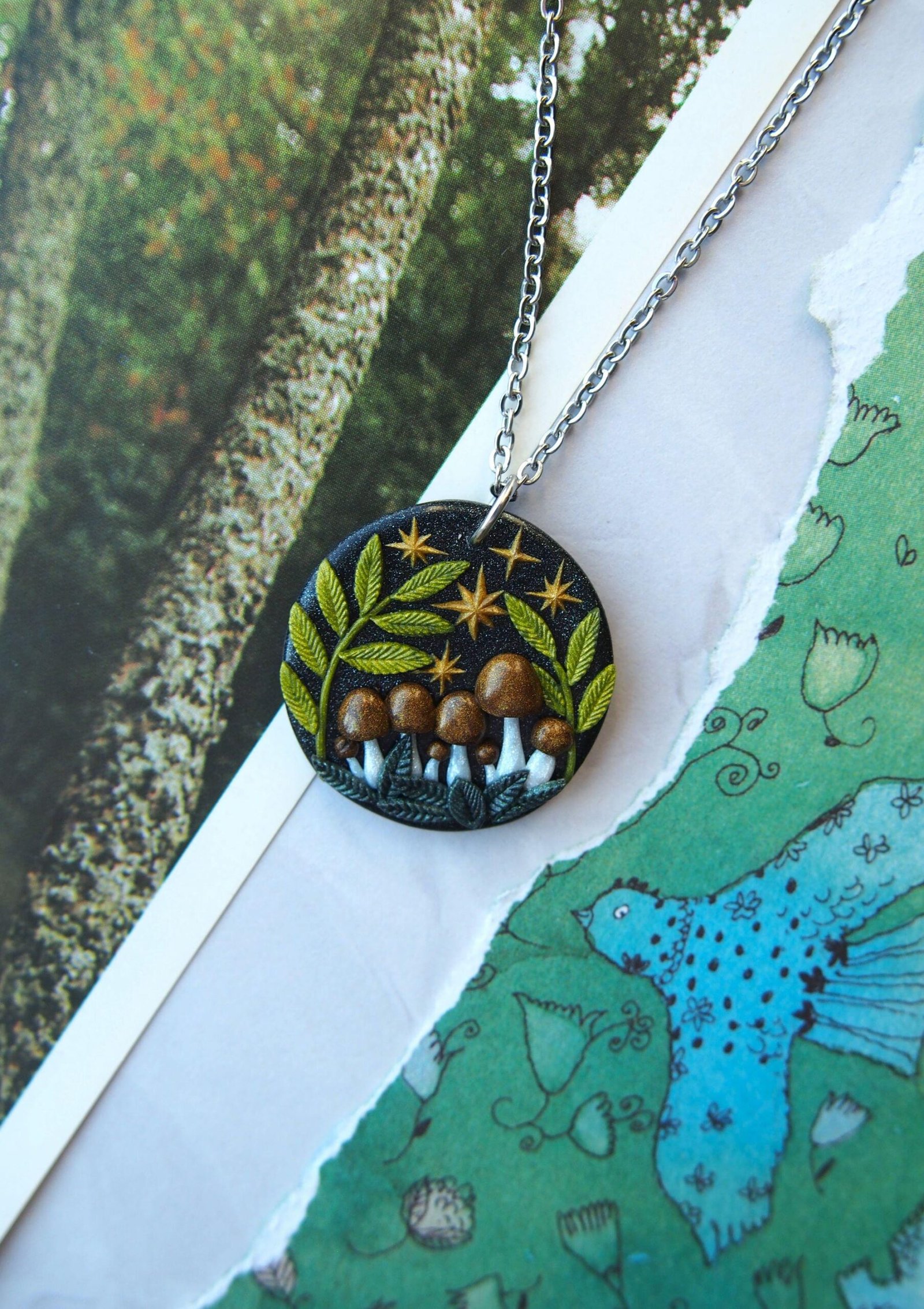 Larger Brown Mushroom Pendant – Celestial Fern Necklace – Polymer Clay & Stainless Steel