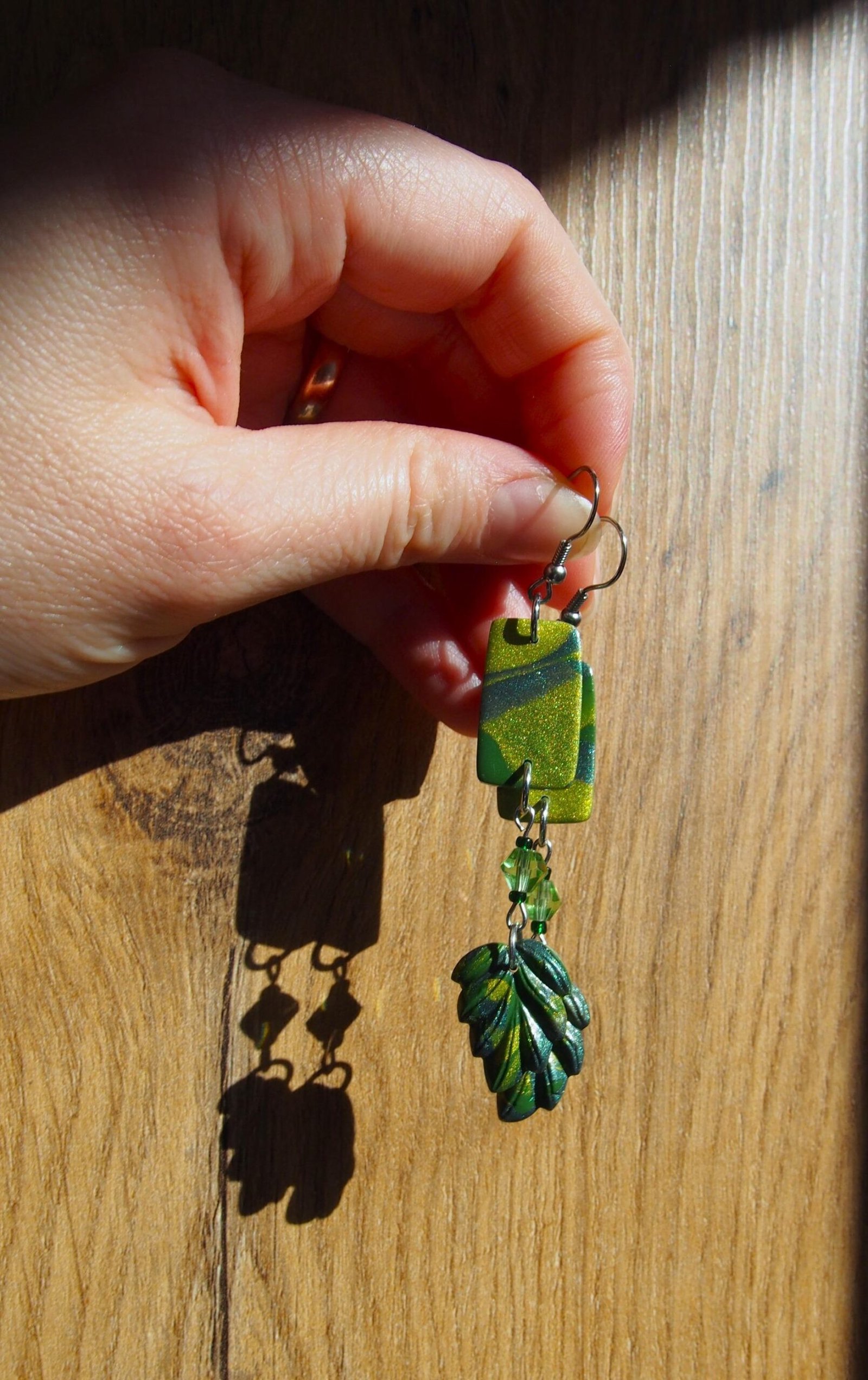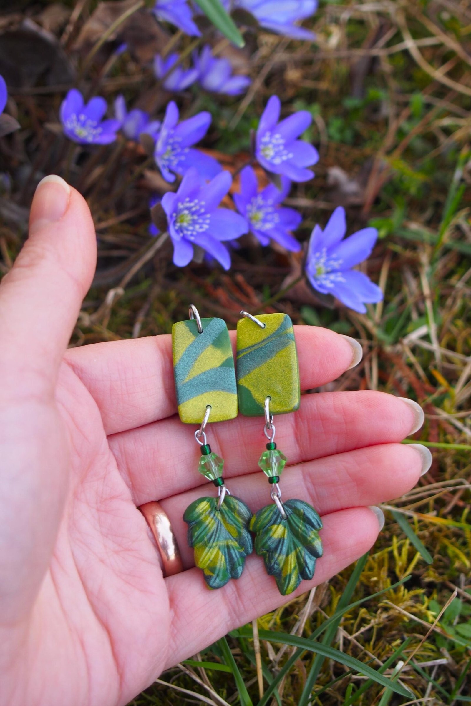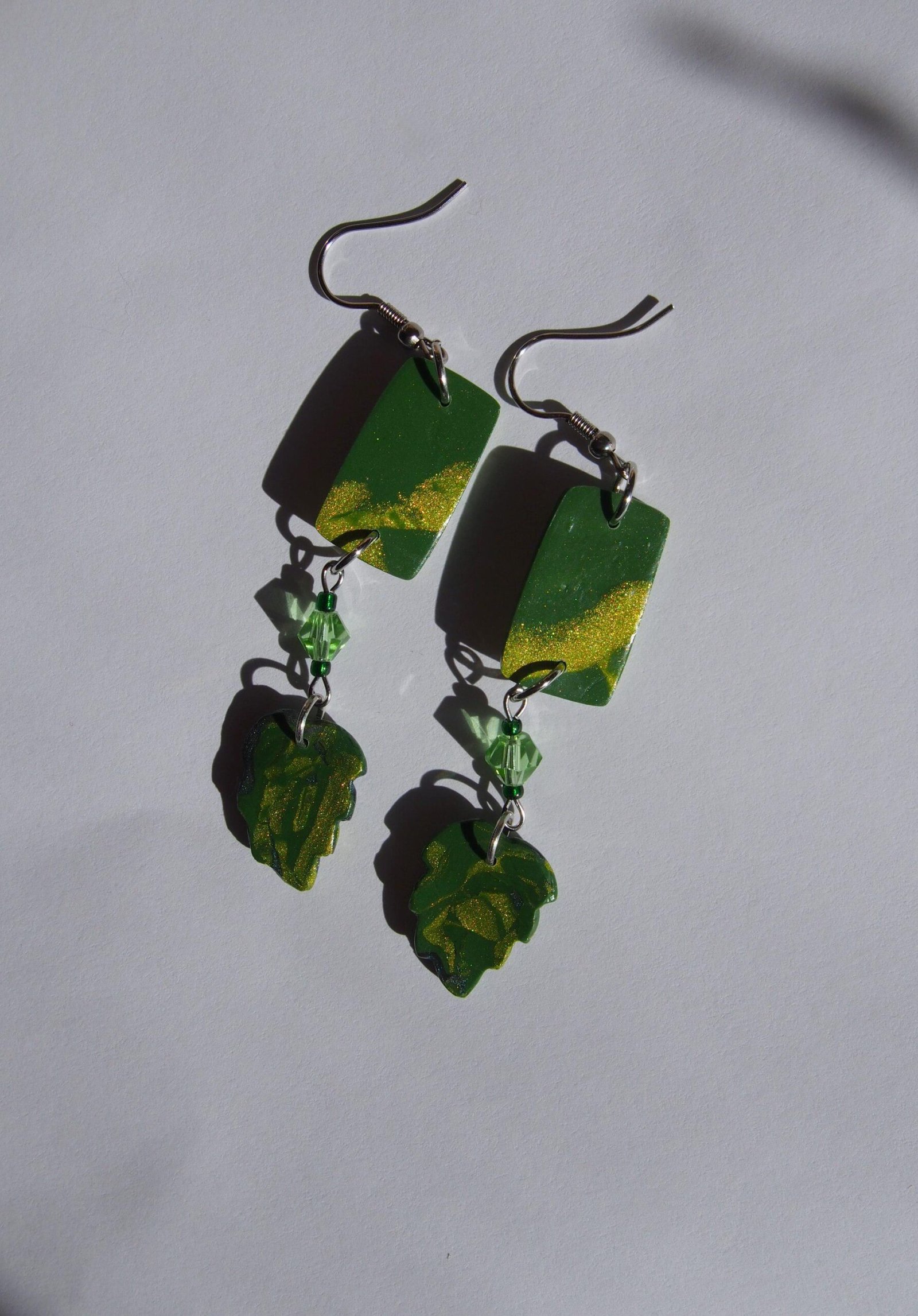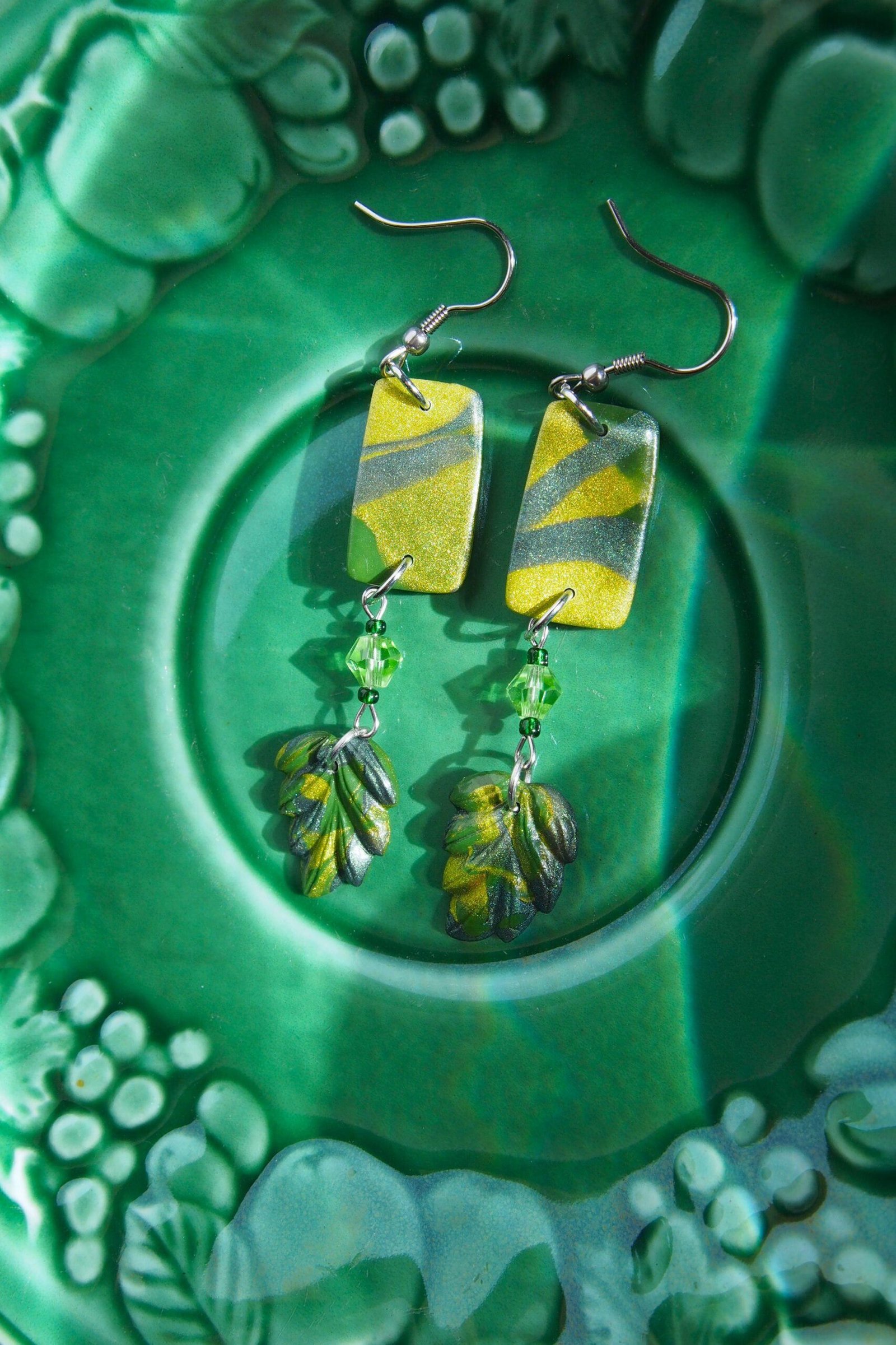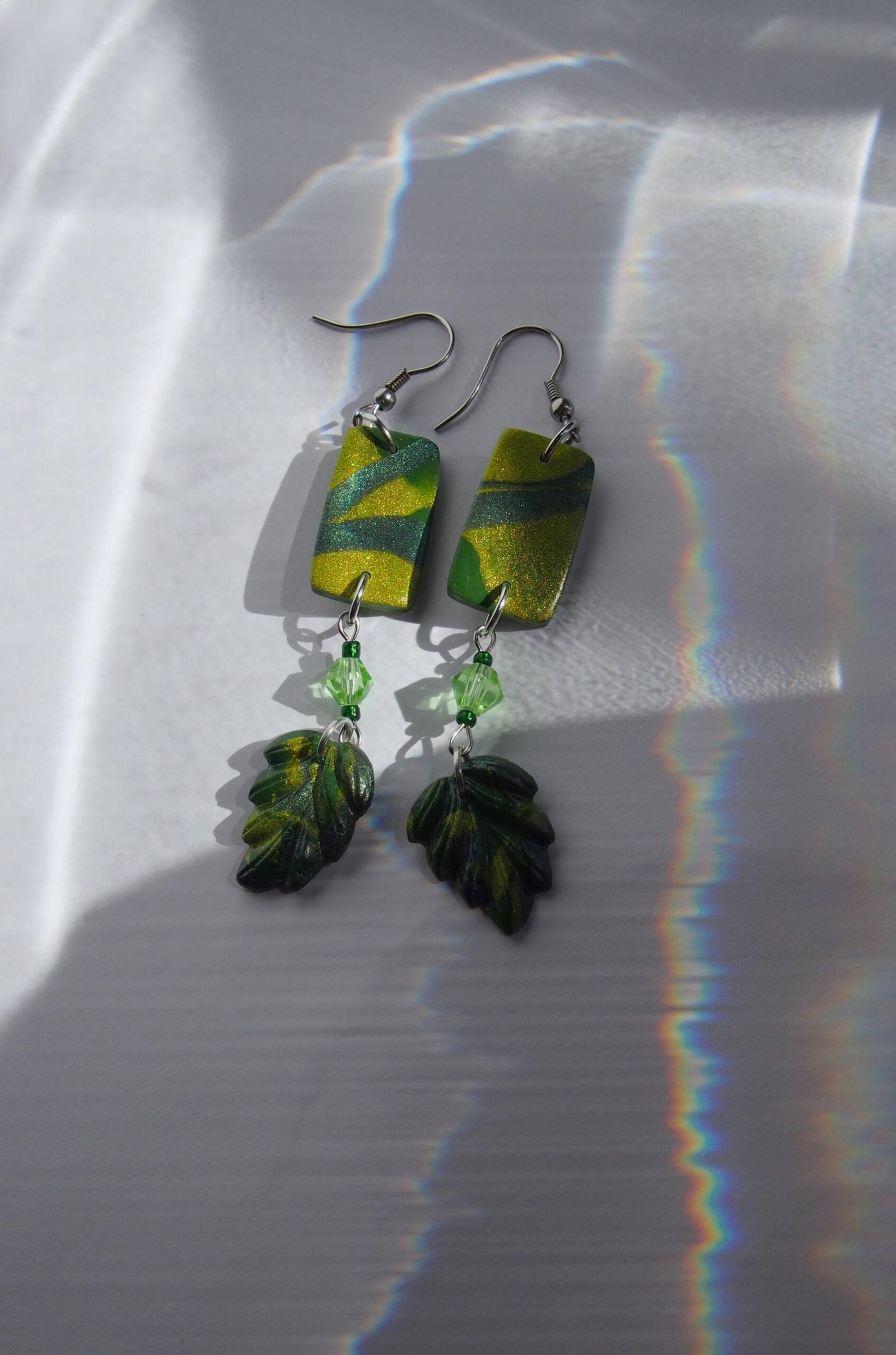 These whimsical fairycore earrings evoke the serene beauty of sun-dappled forest trails. Handcrafted from shimmering polymer clay in vibrant shades of mossy green and forest hues, each pair features delicate leaf charms accented by sparkling beads. They sway gently with your every step, creating subtle sparkle and soft movement reminiscent of wind chimes hidden among woodland trees.
