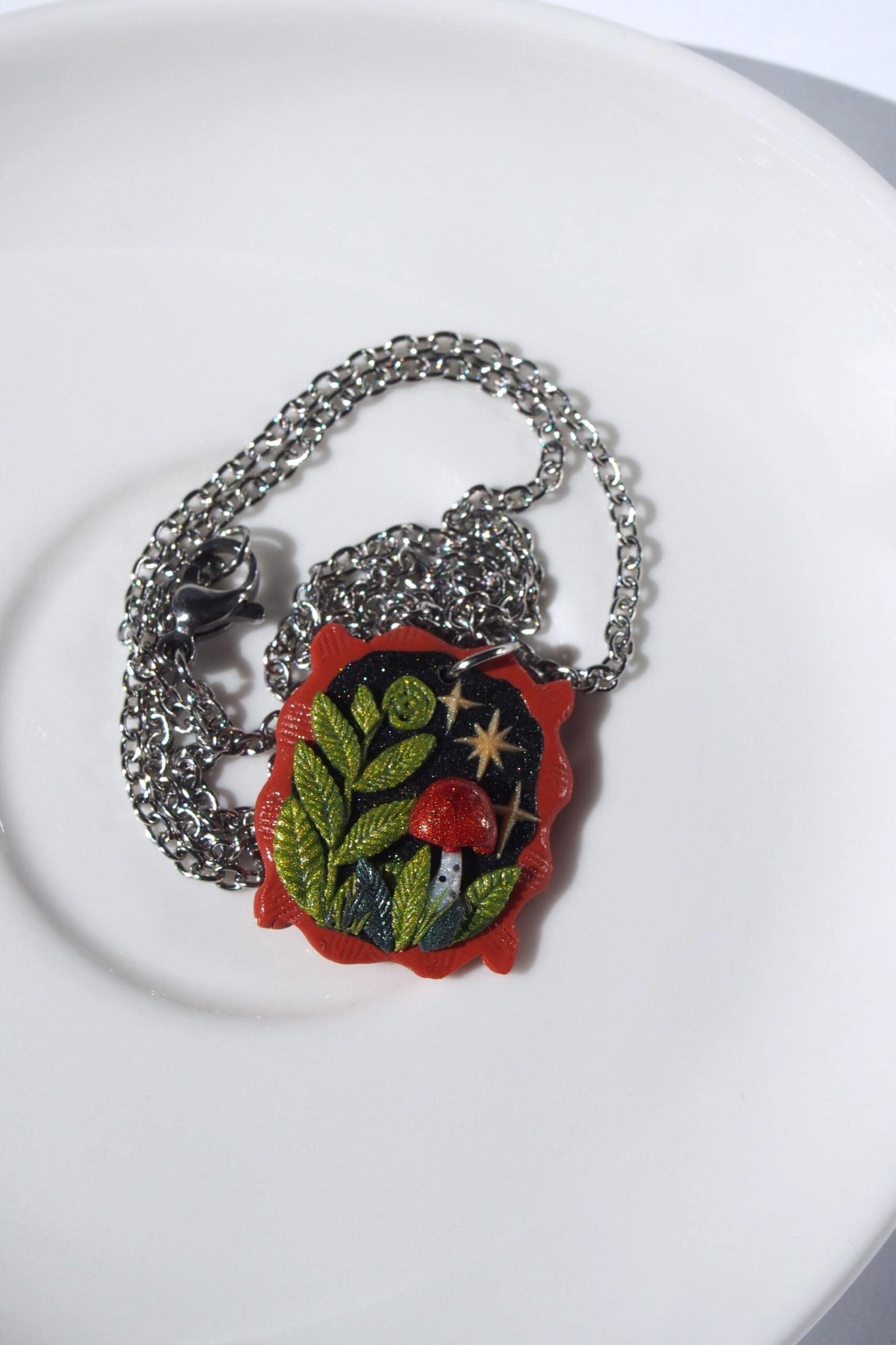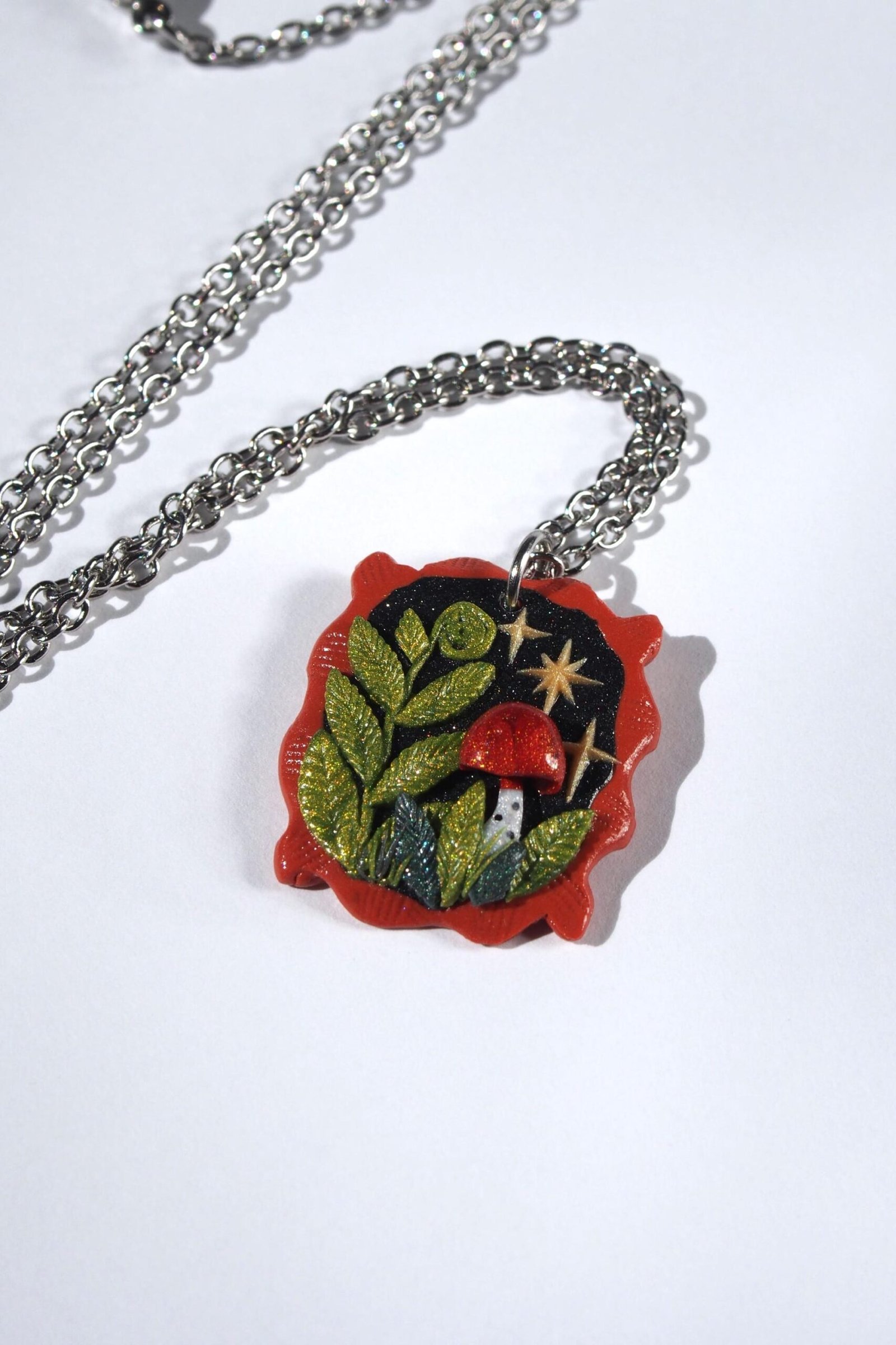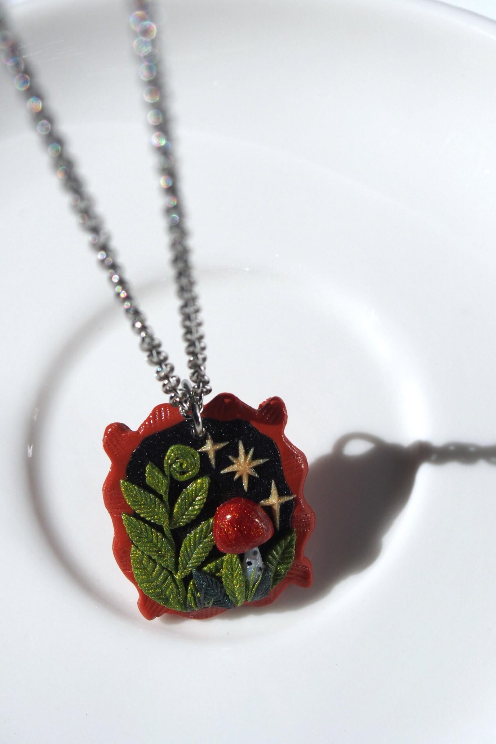 Like all my creations, this mushroom pendant is one of a kind, celebrating the unique character that comes from a handmade process. A magical forest scene unfolds under twinkling stars, with a vibrant red mushroom nestled among lush green ferns. Each tiny element is composed by hand, creating this mystical miniature world. This detailed process ensures the piece you see pictured is the exact one you will receive.