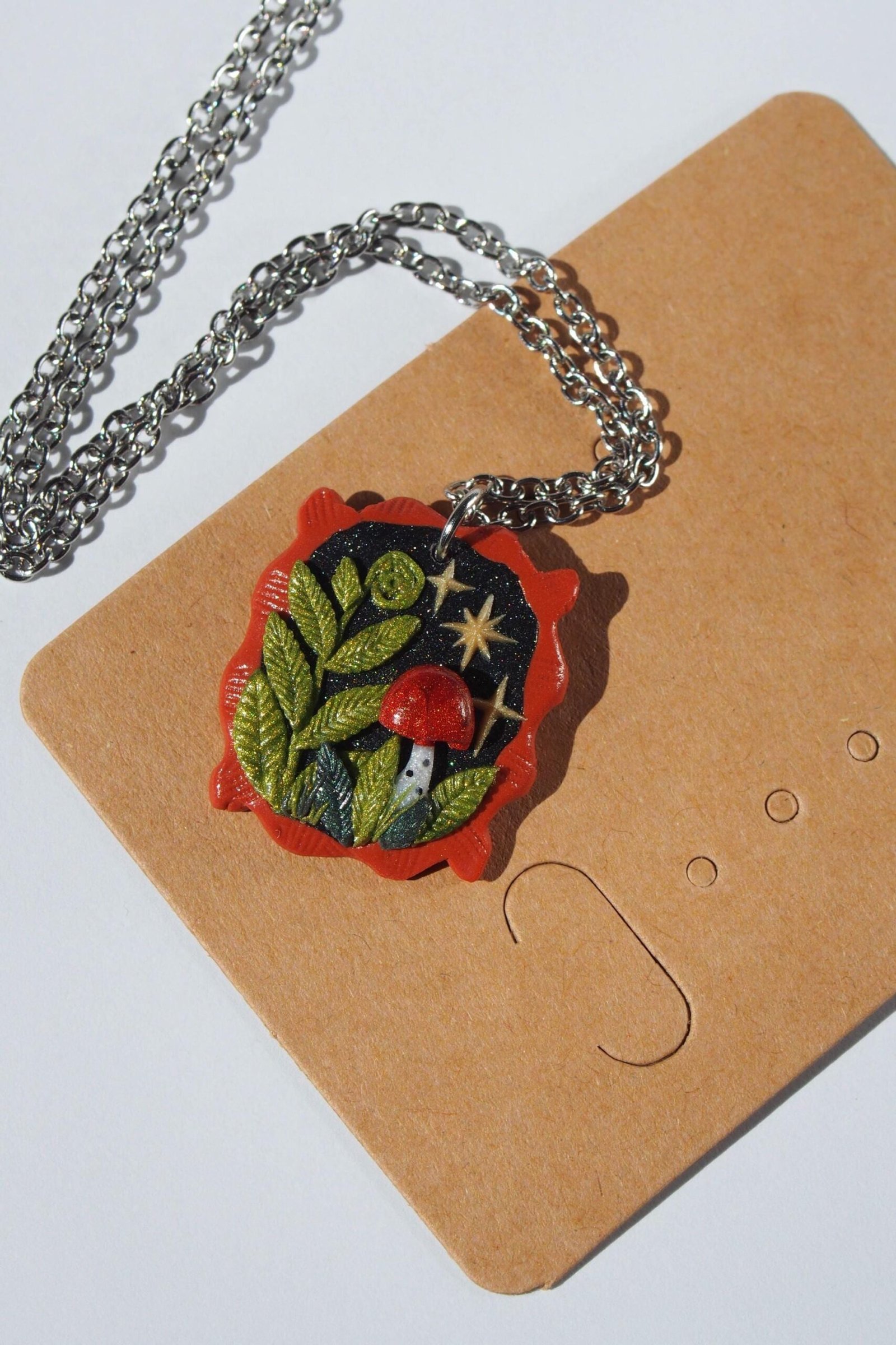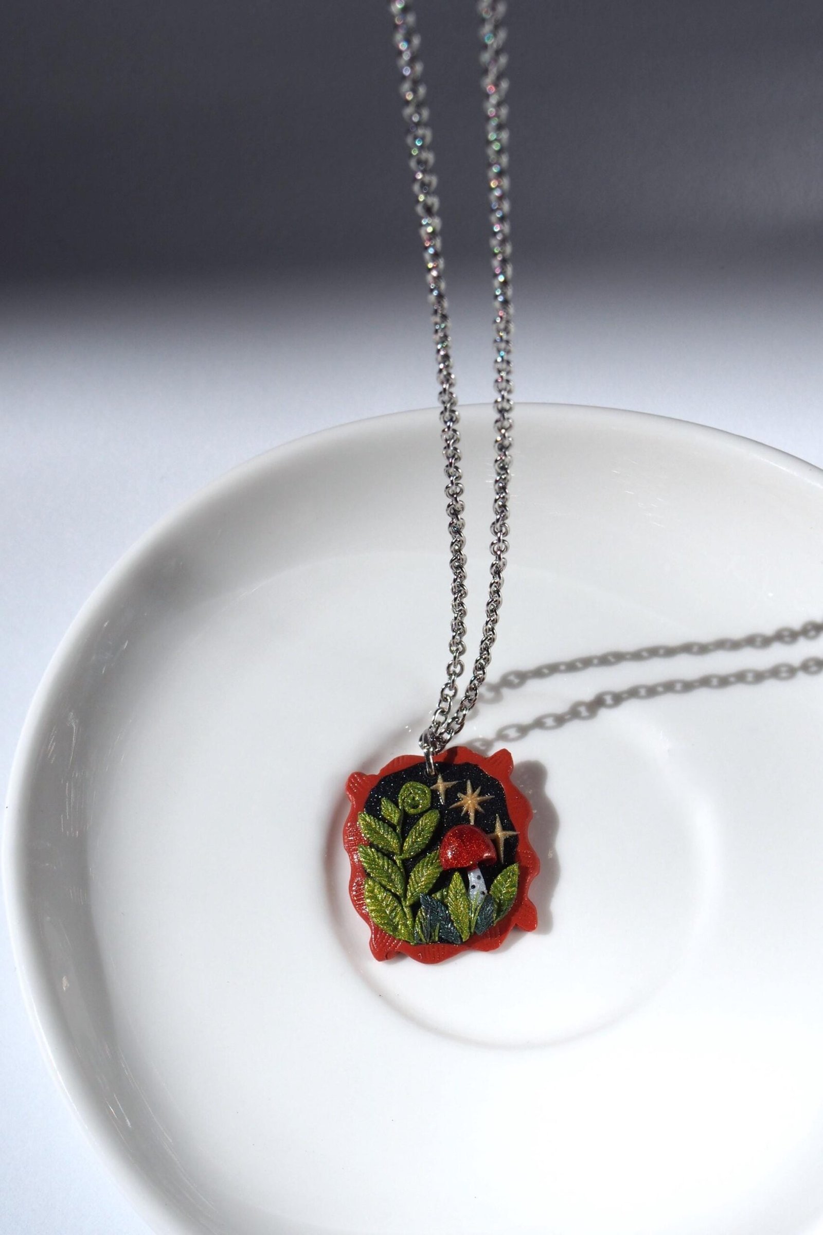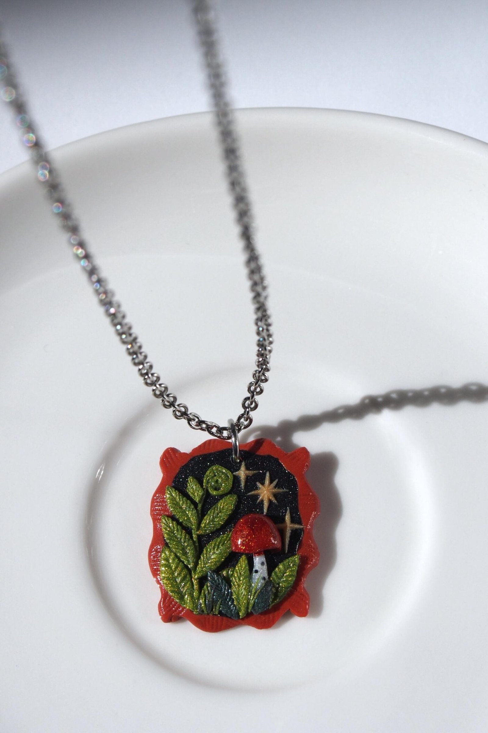 Like all my creations, this mushroom pendant is one of a kind, celebrating the unique character that comes from a handmade process. A magical forest scene unfolds under twinkling stars, with a vibrant red mushroom nestled among lush green ferns. Each tiny element is composed by hand, creating this mystical miniature world. This detailed process ensures the piece you see pictured is the exact one you will receive.