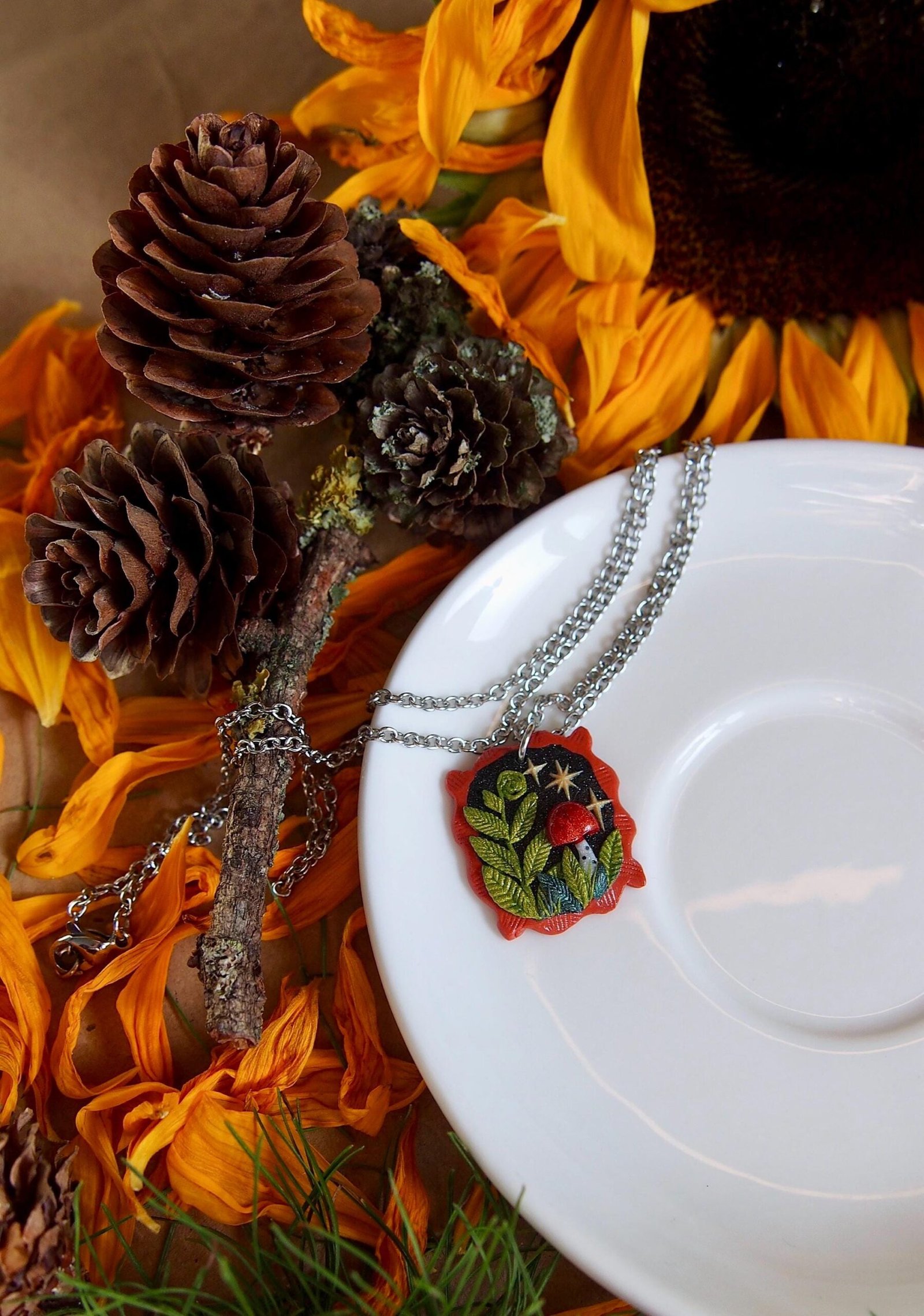 Feel the quiet magic of an enchanted forest under the stars with this celestial mushroom necklace. A little piece of wearable art and starlit nature that you can carry with you. If you like whimsical jewelry with fungi and cottagecore vibes, perhaps this woodland pendant is just for you.