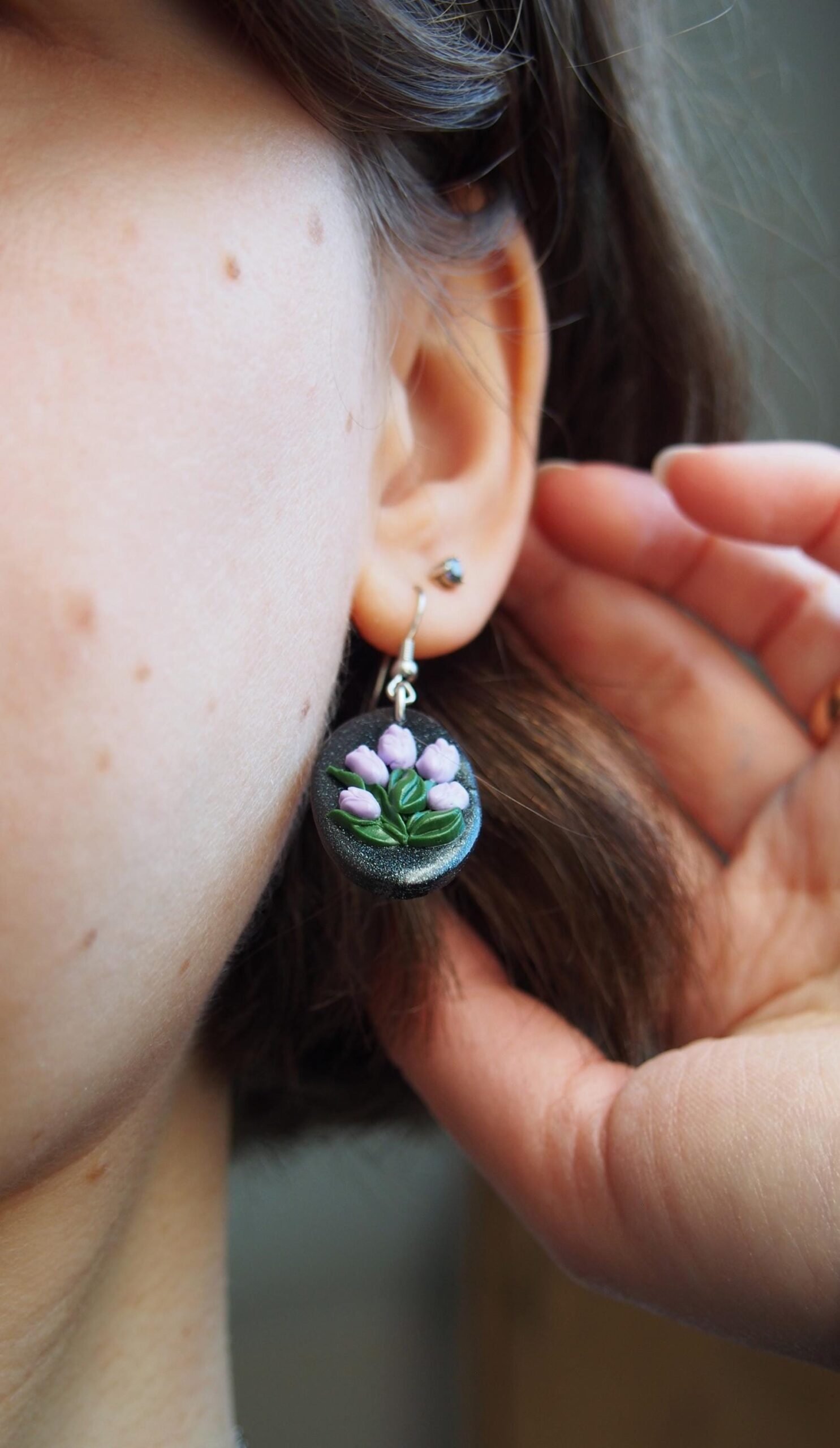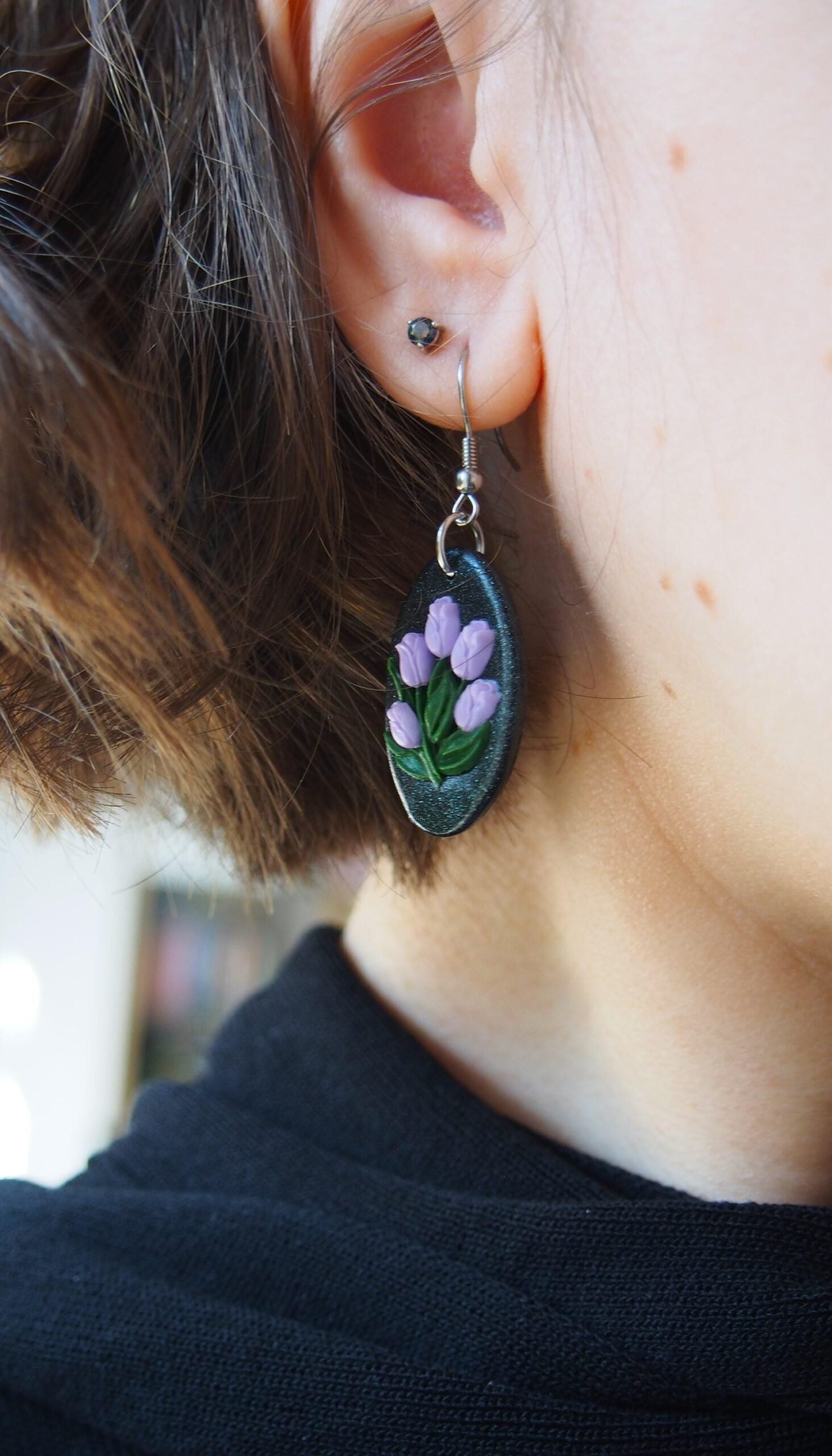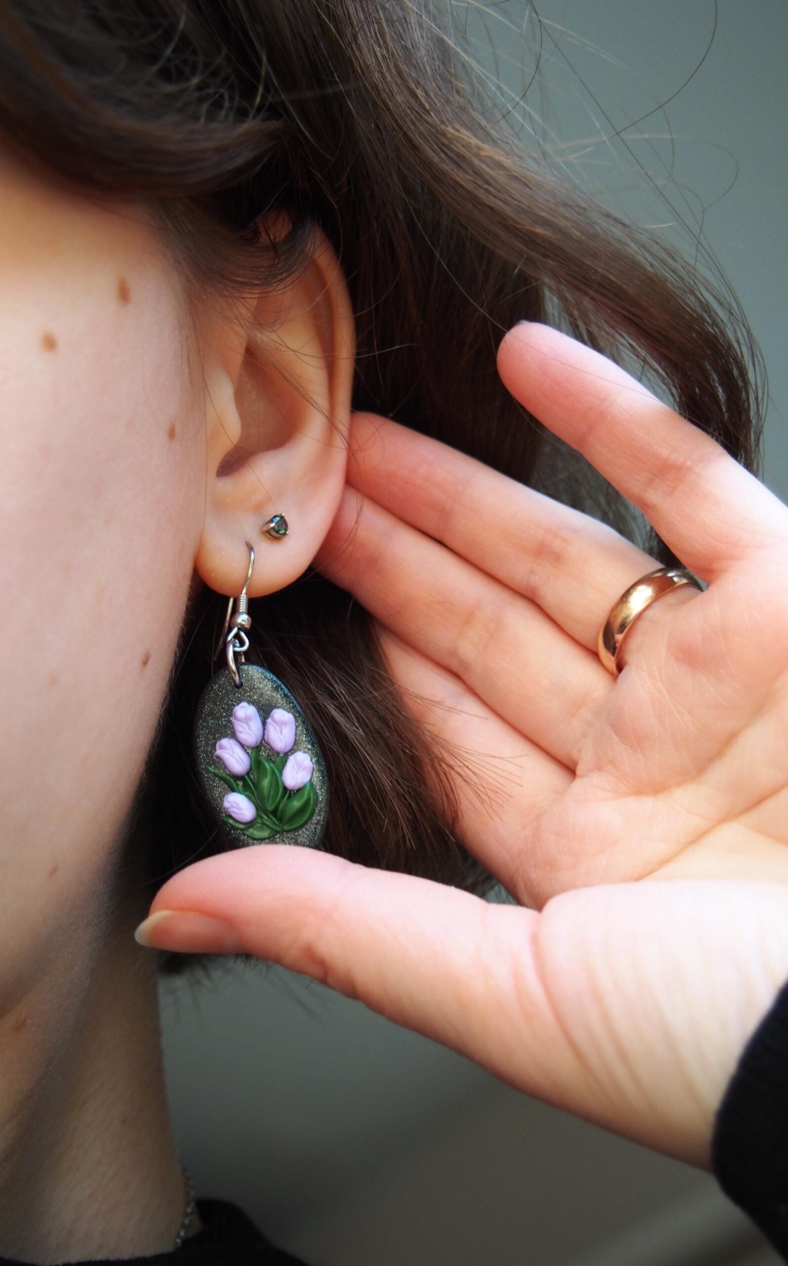 Looking for a unique Spring accessory with flowers? Perhaps these purple tulip earrings are just for you. Like all my creations, they are handmade and one of a kind. I always change something and never repeat a design. Thus, you can be sure that the pair you see pictured is the exact one you will receive – a unique tulip bouquet just for you.
