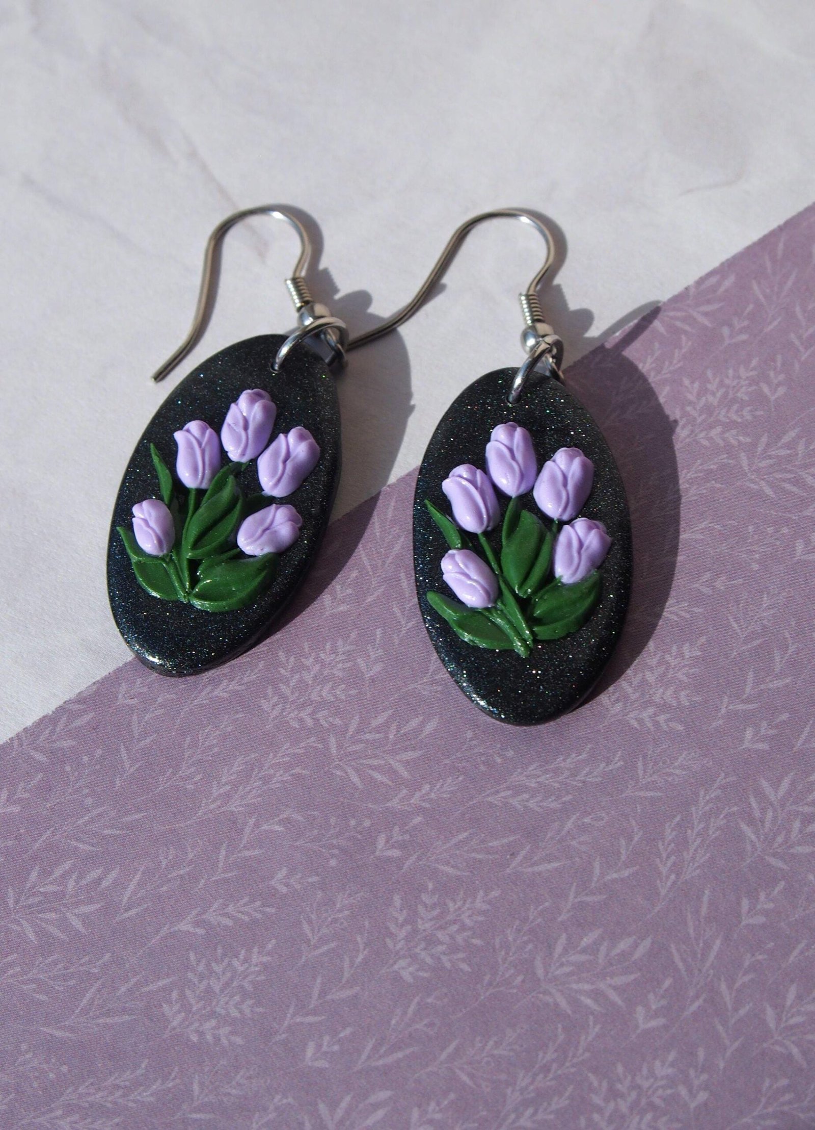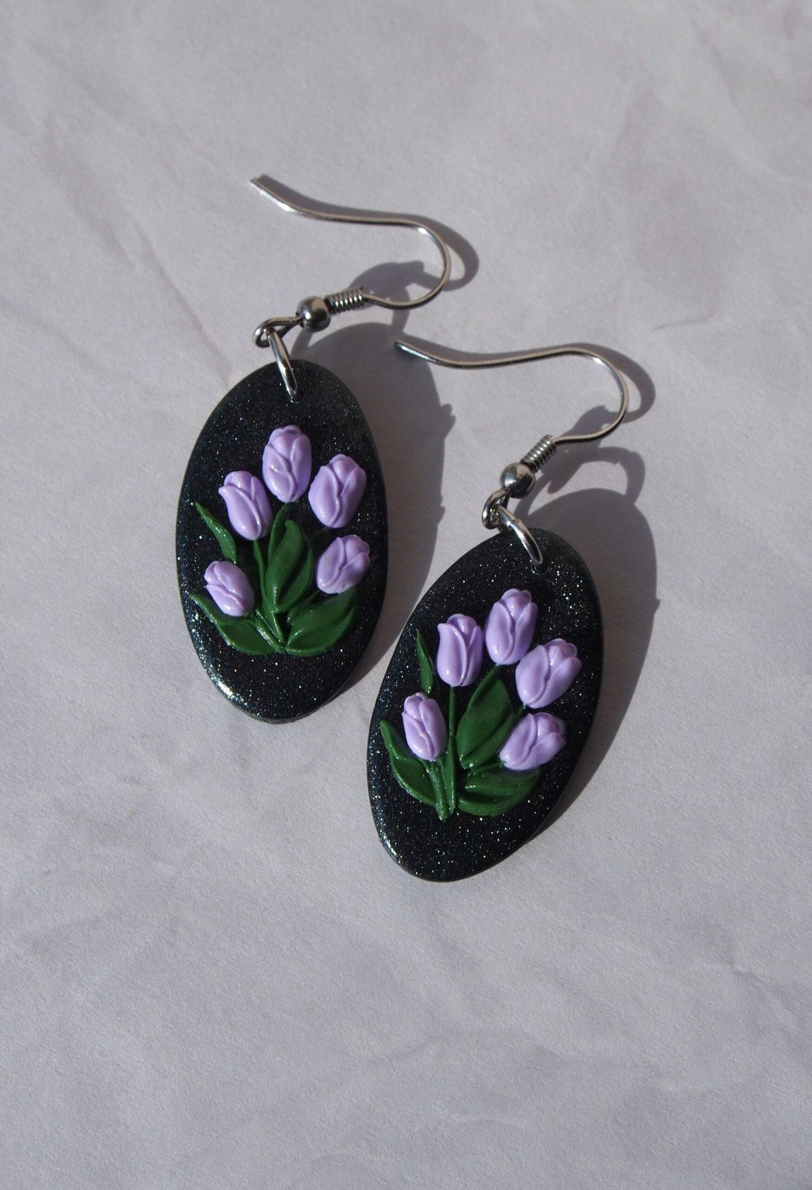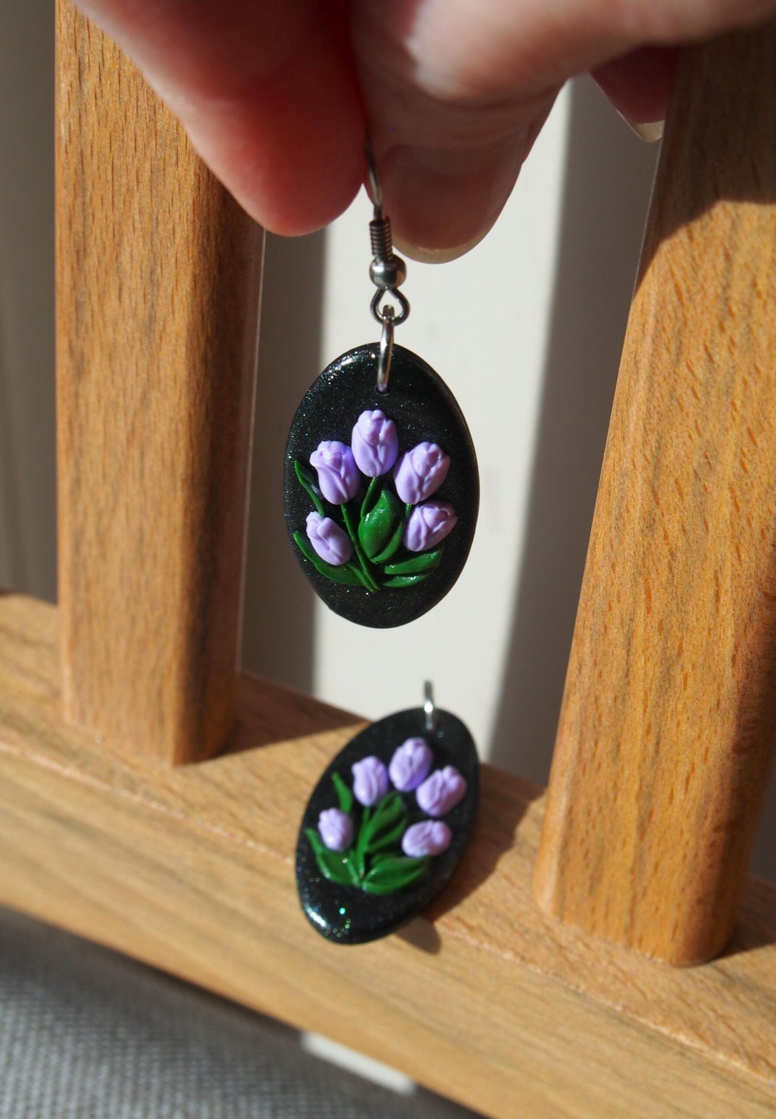 Purple Tulip Earrings with Surgical Steel Hooks : Botanical Spring Gift from Polymer Clay