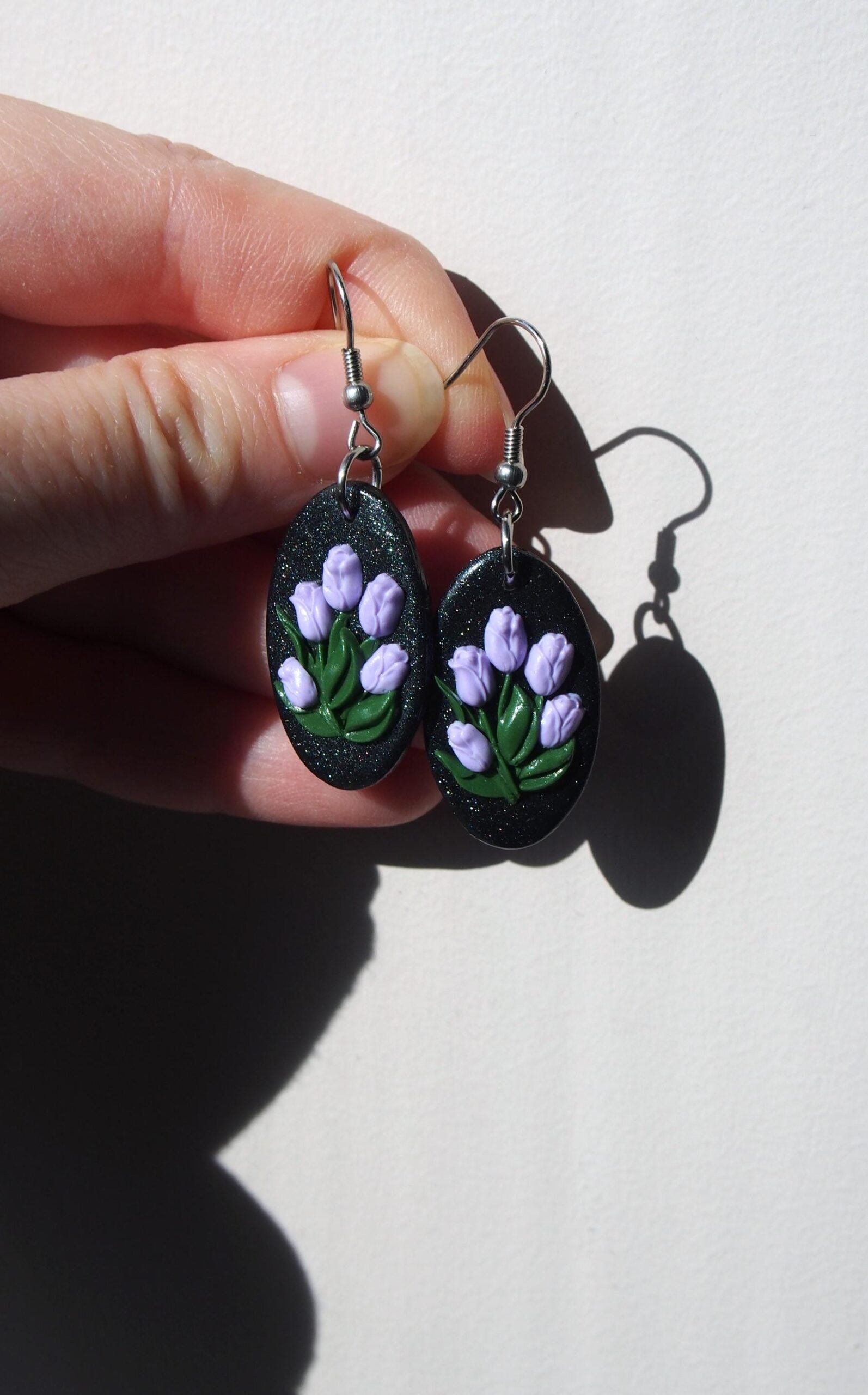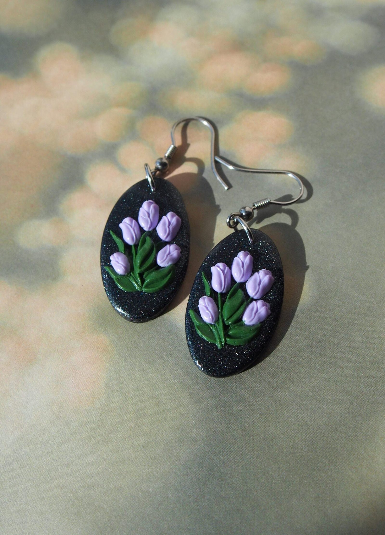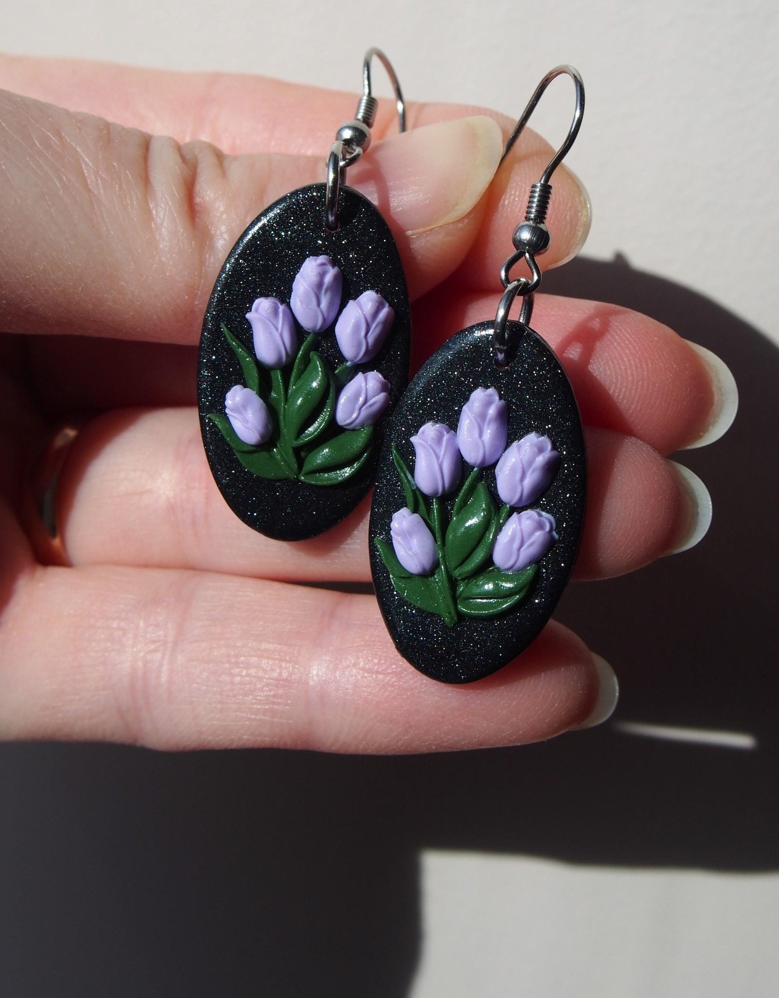 Purple Tulip Earrings with Surgical Steel Hooks : Botanical Spring Gift from Polymer Clay